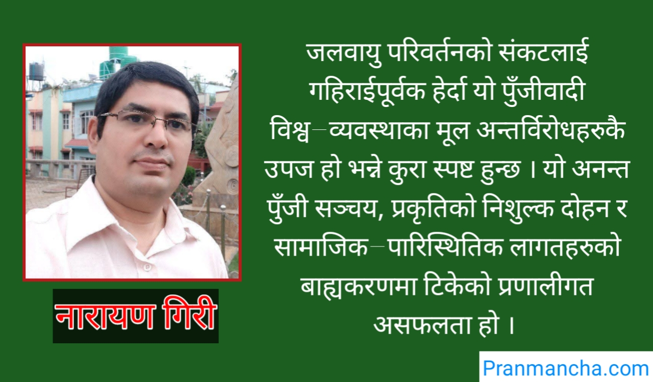 जलवायु परिवर्तनको संकटलाई गहिराईपूर्वक हेर्दा यो पुँजीवादी विश्व–व्यवस्थाका मूल अन्तर्विरोधहरुकै उपज हो भन्ने कुरा स्पष्ट हुन्छ ।