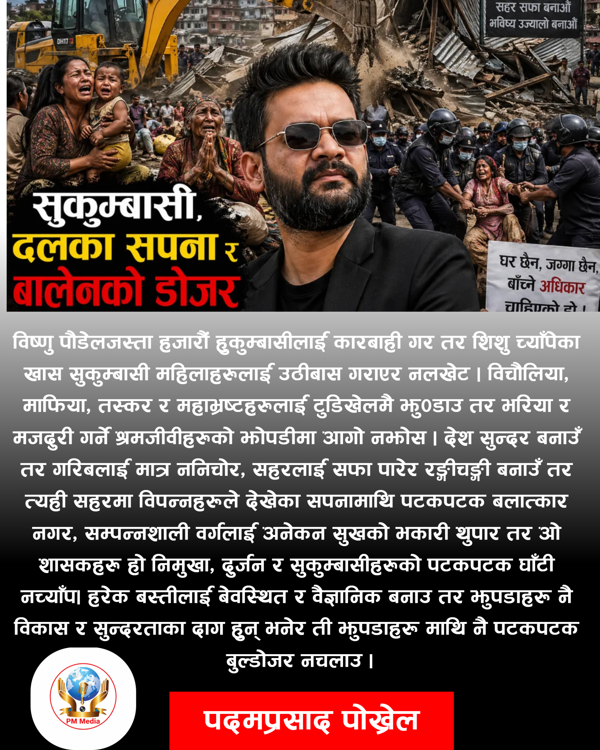 विष्णु पौडेलजस्ता हजारौं हुकुम्बासीलाई कारबाही गर तर शिशु च्याँपेका खास सुकुम्बासी महिलाहरुलाई उठीबास गराएर नलखेट । विचौलिया, माफिया, तस्कर र महाभ्रष्टहरुलाई टुँडिखेलमै झुण्डाउ तर भरिया र मजदुरी गर्ने श्रमजीवीहरुको झोपडीमा आगो नझोस ।