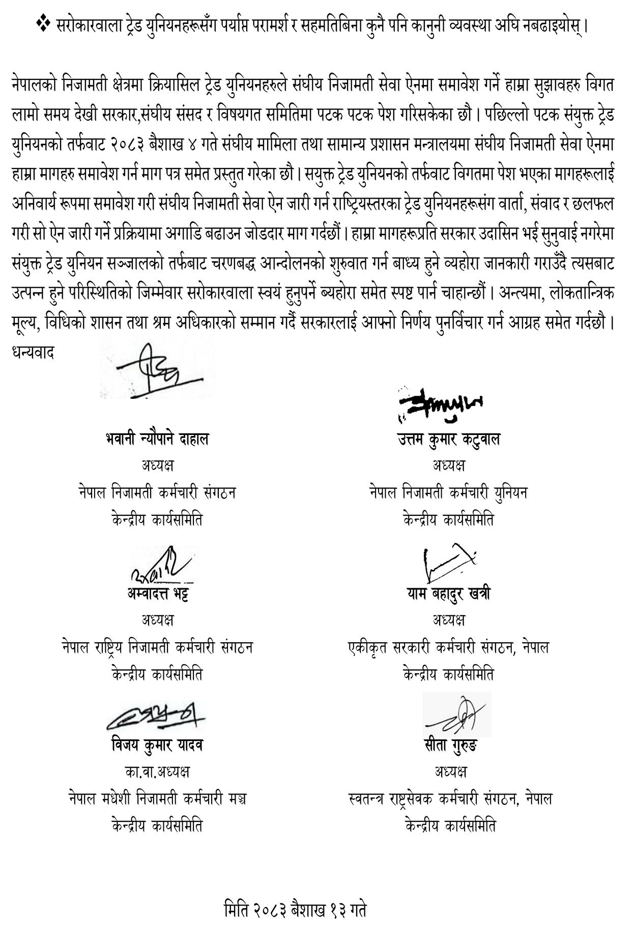 उनीहरुले संयुक्त विज्ञप्तिमार्फत सार्वजनिक सेवामा कार्यरत कर्मचारीको हकहित संरक्षण, सहभागिता र सामूहिक सौदाबाजीको अधिकारलाई कानुनी रूपमा मजबुत बनाउनसमेत आग्रह गरेका छन् ।