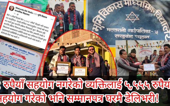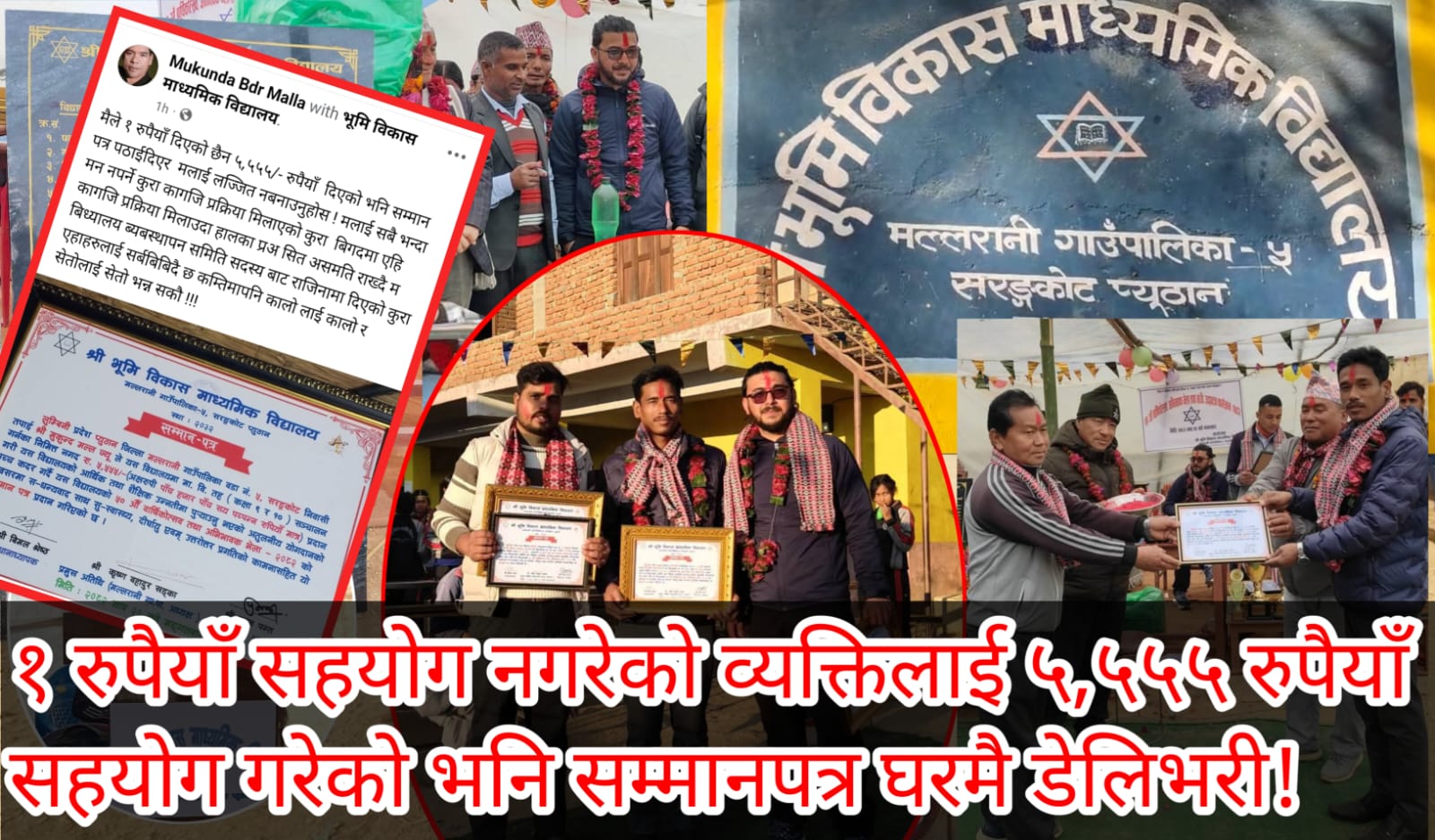 २२ माघ, प्युठान विभिन्न घटनाक्रमले चर्चा र विवादको केन्द्रमा रहेको भुमी विकास माध्यमिक विद्यालयमा आर्थिक सहयोग नै नगरेको मानिसलाई आर्थिक सहयोग गरेको प्रमाणपत्र प्रदान गरिएको विषयले पुनः विवाद उत्पन्न गराएको छ । विद्यालयमा १ रुपैयाँ पनि नगद सहयोग नगरेको व्यक्तिलाई...