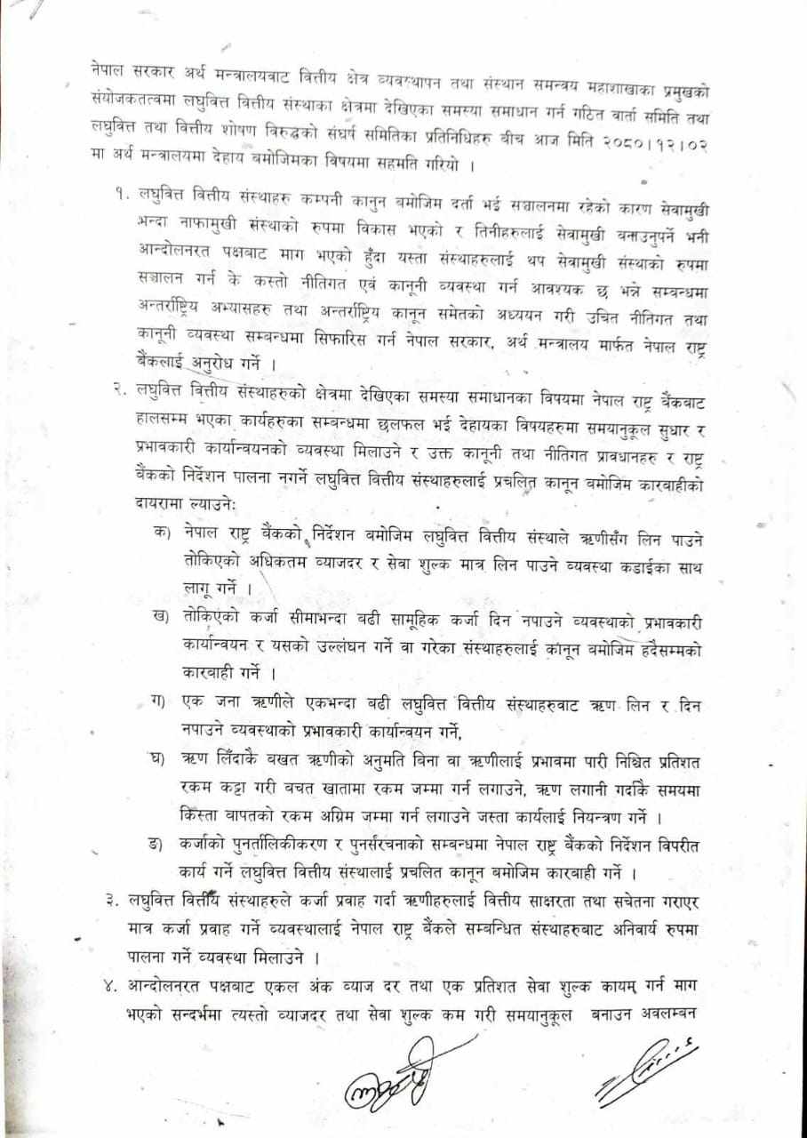 अर्थमन्त्रालयमा भएको वार्तामा ६ बुँदे सहमति भएको हो। सहमतिपत्रमा लघुवित्तलाई सेवामुखी बनाउन के गर्न सकिन्छ भन्ने विषयमा कानुनी व्यवस्थाका लागि राष्ट्र बैंकलाई सिफारिस गर्न अनुरोध गर्नेलगायतका विषय समेटिएको छ।
