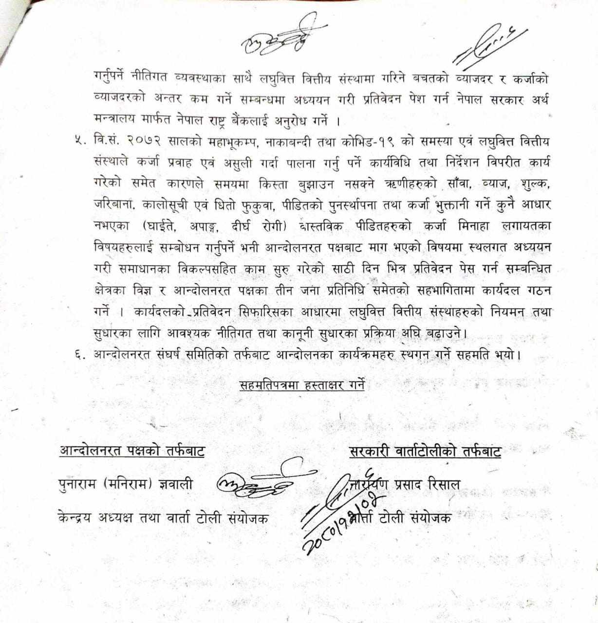 आज भएको सहमतिपत्रमा सरकारको तर्फबाट वार्ता टोलीका संयोजक सह–सहसचिव एवम् वित्तीय क्षेत्र व्यवस्थापन तथा संस्थान महाशाखा प्रमुख नारायणप्रसाद रिसाल र आन्दोलनकारीका तर्फबाट वार्ता टोली संयोजक पुनाराम (मनिराम) ज्ञवालीले हस्ताक्षर गरेका छन्।