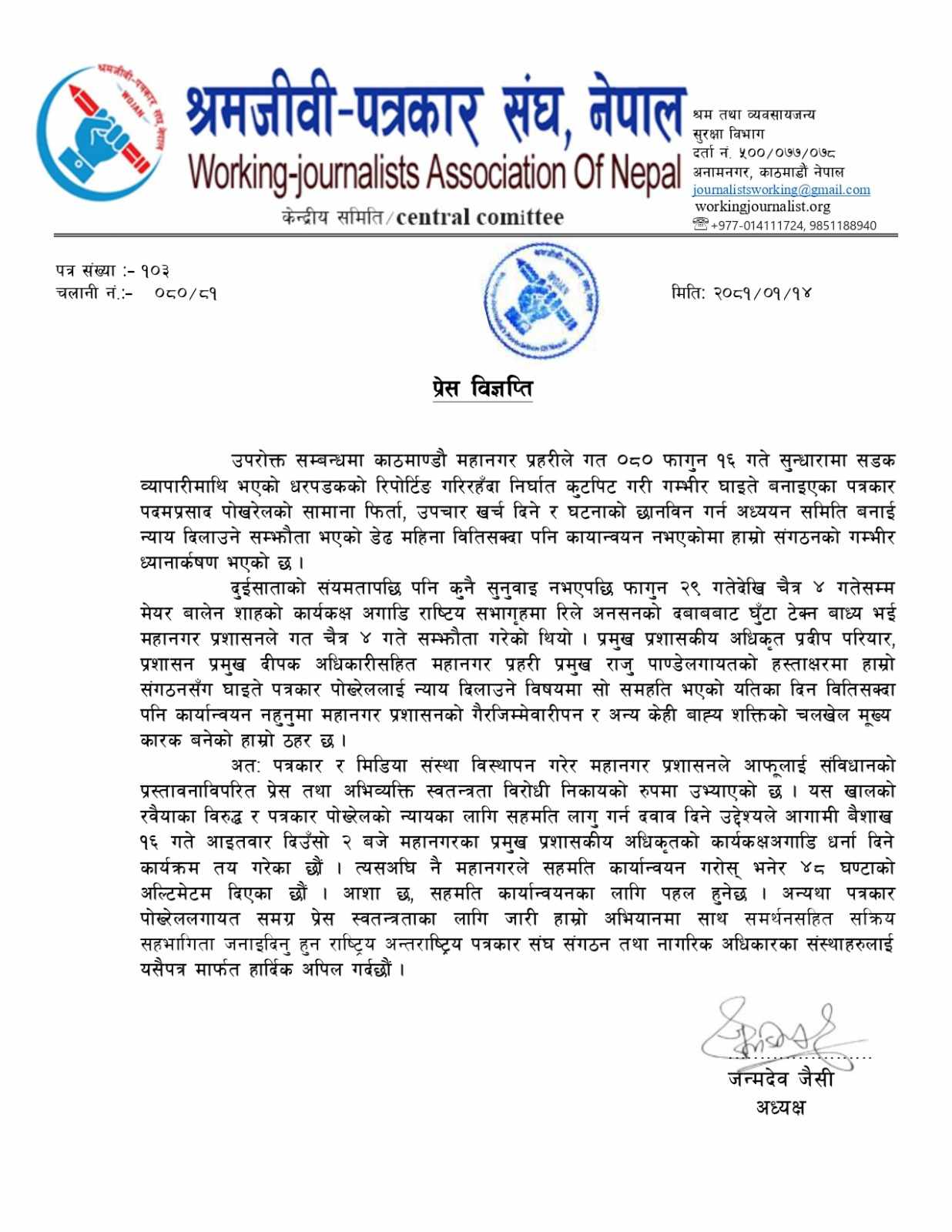 उपरोक्त सम्बन्धमा काठमाण्डौ महानगर प्रहरीले गत ०८० फागुन १६ गते सुन्धारामा सडक व्यापारीमाथि भएको धरपडकको रिपोर्टिङ गरिरहँदा निर्घात कुटपिट गरी गम्भीर घाइते बनाइएका पत्रकार पदमप्रसाद पोखरेलको सामाना फिर्ता, उपचार खर्च दिने र घटनाको छानविन गर्न अध्ययन समिति बनाई न्याय दिलाउने सम्झौता भएको डेढ महिना वितिसक्दा पनि कायान्वयन नभएकोमा हाम्रो संगठनको गम्भीर ध्यानार्कषण भएको छ ।