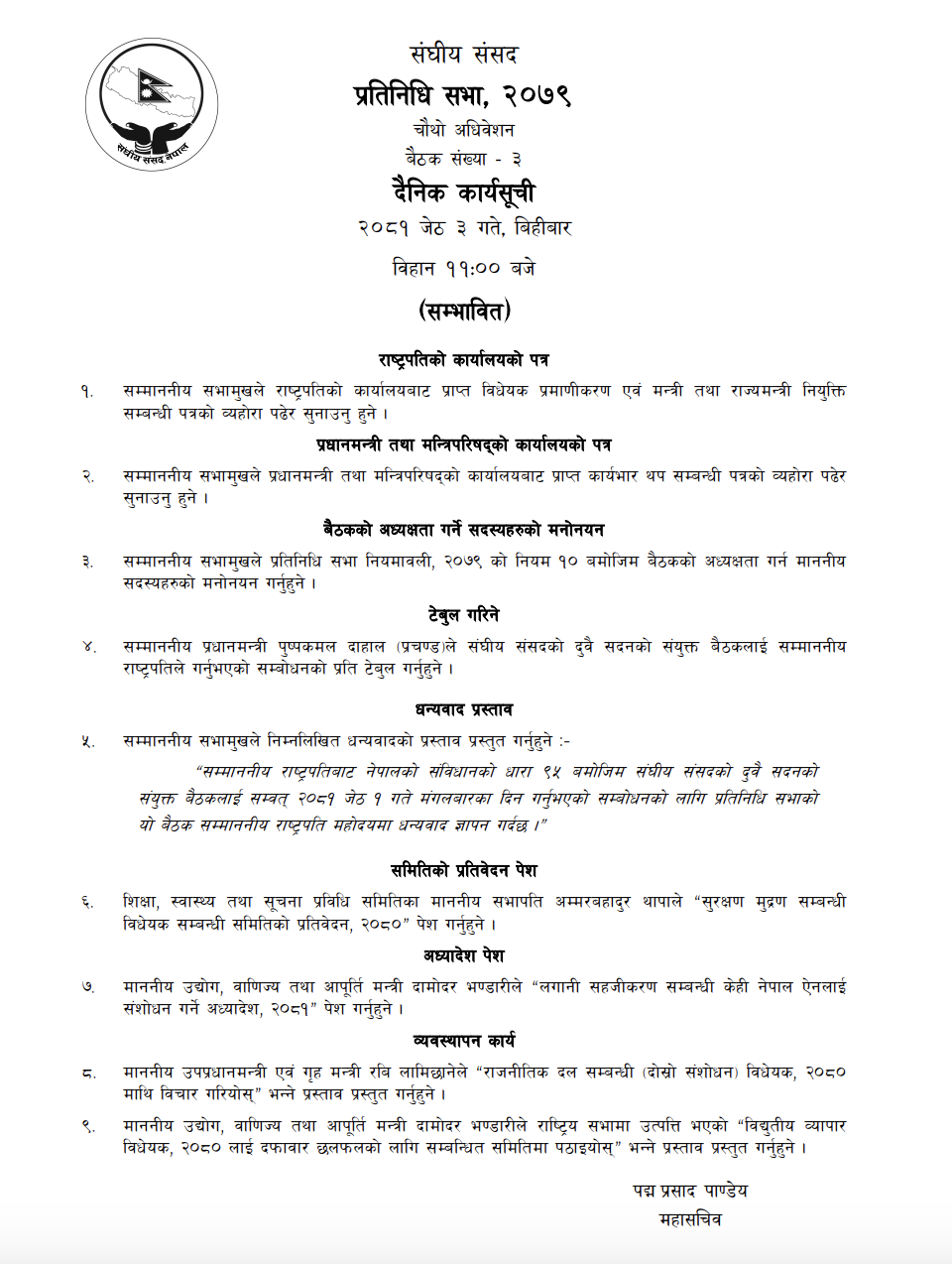यस्तै प्रतिनिधिसभा बैठकको अध्यक्षता गर्ने सदस्यहरूको मनोनयन गर्ने, प्रधानमन्त्री प्रचण्डले सङ्घीय संसद्को दुवै सदनको संयुक्त बैठकलाई राष्ट्रपतिले गरेको सम्बोधनको प्रति टेबुल गर्ने कार्यसूची तय गरिएको छ । राष्ट्रपतिबाट नेपालको संविधानको धारा ९५ बमोजिम सङ्घीय संसद्को दुवै सदनको संयुक्त बैठकलाई जेठ १ गते मङ्गलवार गरेको सम्बोधनको लागि प्रतिनिधिसभाको तर्फबाट धन्यवाद ज्ञापन गर्ने कार्यसूची रहेको छ ।