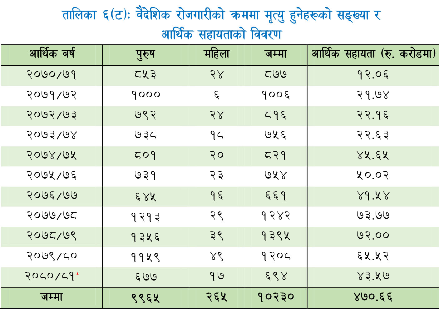 सरकारले सार्वजनिक गरेको गत फागुनसम्मको तथ्यांक अनुसार आर्थिक वर्ष २०७०/७१ देखि चालु आर्थिक वर्षको फागुन मसान्त सम्म वैदेशिक रोजगारीका लागि विभिन्न देशमा पुगेका १० हजारभन्दा धेरै नेपाली नागरिकले ज्यान गुमाएका हुन्।