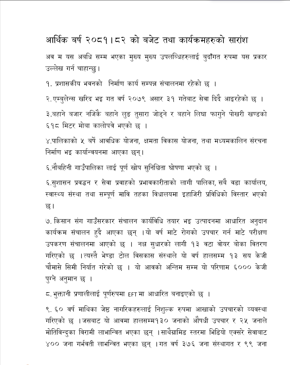 नौबहीन गाउँपालिकाले आगामी आर्थिक वर्ष ८१/८२ का लागि बजेट सार्वजनिक गरेको छ ।