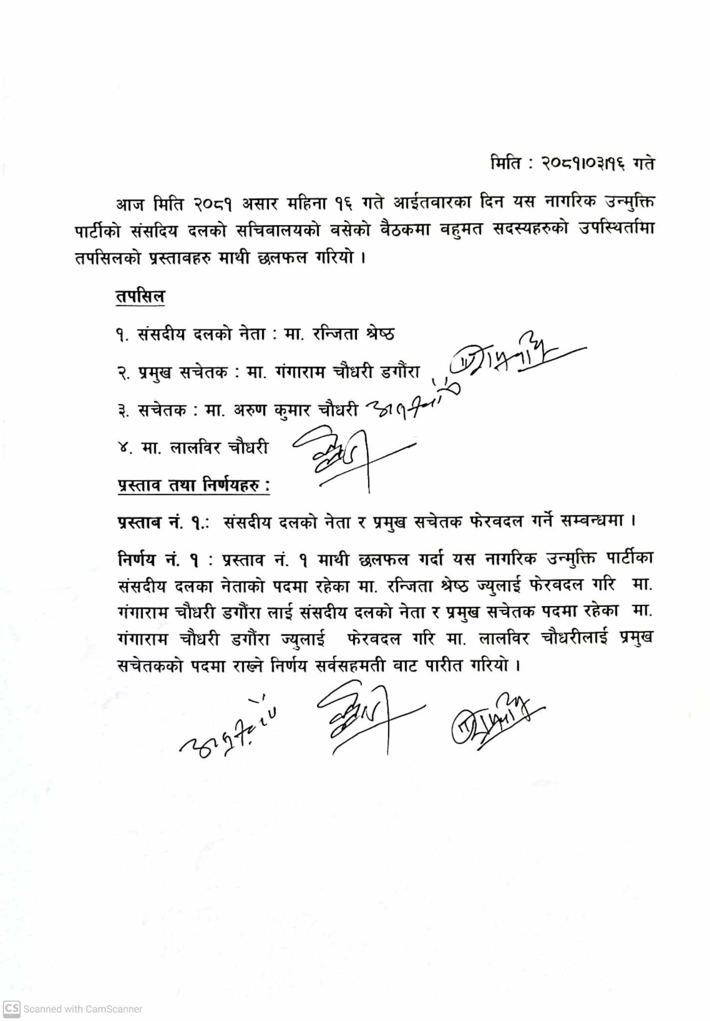 त्यस्तै प्रमुख सचेतक पदमा रहेका डगौराको स्थानमा लालवीर चौधरीलाई प्रमुख सचेतक बनाउने निर्णय सर्वसम्मतिबाट पारित गरिएको नागरिक उन्मुक्ति पार्टीको विज्ञप्तीमा उल्लेख छ।