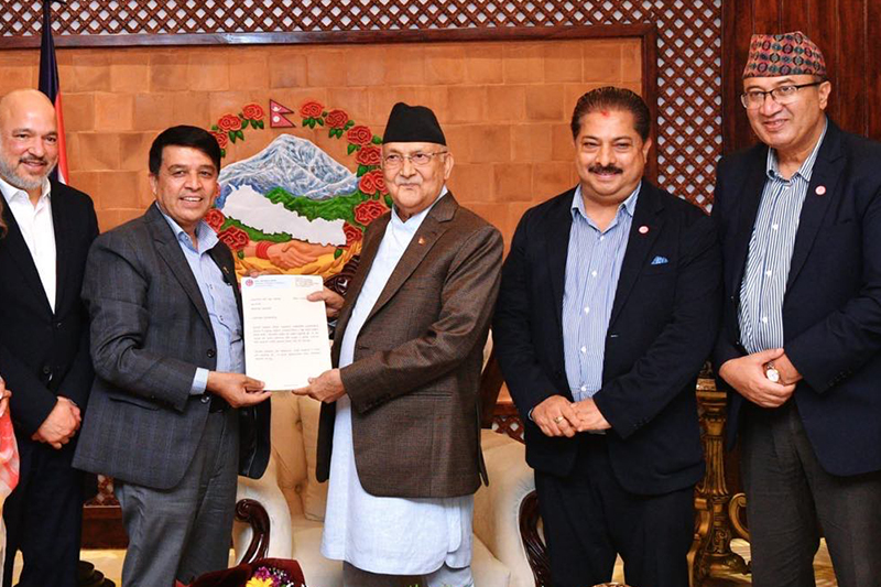 नेपाल उद्योग वाणिज्य महासङ्घका पदाधिकारीहरुसँगको भेटमा प्रधानमन्त्री ओलीले निजी क्षेत्रको प्रवर्द्धन एवं विस्तारविना देशको विकास सम्भव नभएको बताउँदै उद्यमी व्यवसायीलाई सहज हुने नीति सरकारले लिने स्पष्ट पारे।