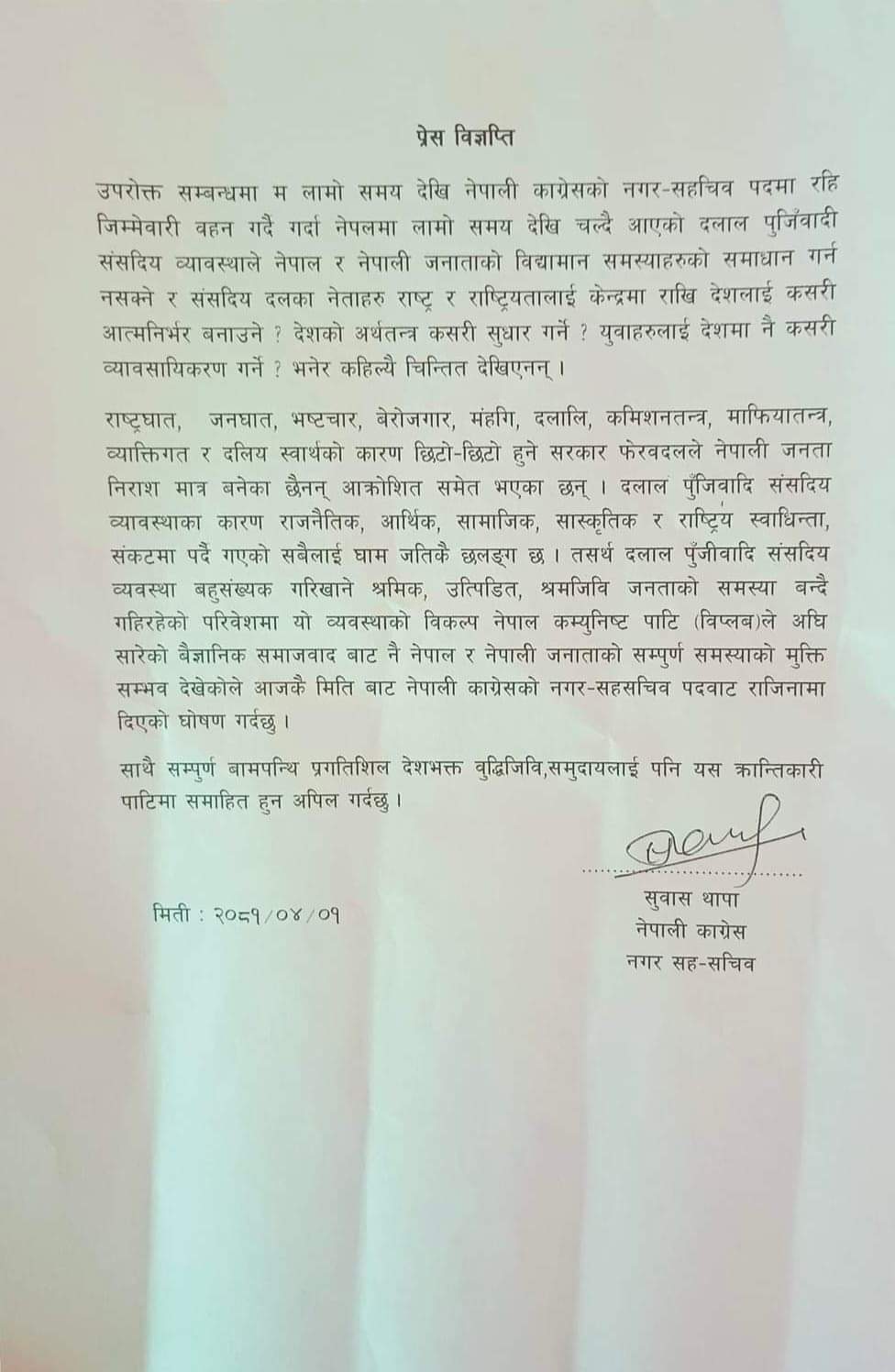 थापाले आज एक प्रेस विज्ञप्ती जारी गर्दै नेपाली कांग्रेस परित्याग गरेको घोषणा गरेका हुन। लामो समयदेखी चल्दै आएको संसदिय व्यवस्थाले नेपाली जनताको बिद्यमान समस्याको समाधान गर्न नसक्ने निश्कर्ष सहित आफु विप्लवले अघि सारेको बैज्ञानिक समाजबादको पक्षमा उभिएको थापाले बताएका छन् ।