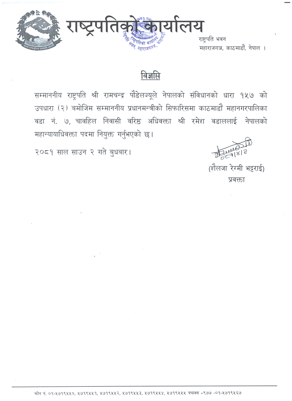 राष्ट्रपति रामचन्द्र पौडेलले बरिष्ठ अधिवक्ता रमेश बडाललाई महान्यायाधिवक्ता पदमा नियुक्त गरेका छन् ।