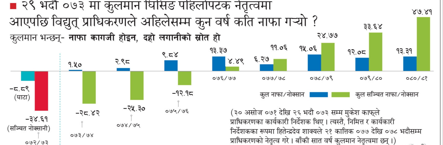 – आठ वर्षअघि ३४ अर्ब ६१ करोड सञ्चित घाटामा रहेको जर्जर अवस्थाको विद्युत् प्राधिकरण ०८०/८१ मा ४७ अर्ब ४१ करोड सञ्चित नाफामा पुगेको छ । त्यस्तै, ०७९/८० मा ३३ अर्ब ६४ करोड र ०७८/७९ मा २४ अर्ब ७७ करोड सञ्चित नाफा गरेको थियो ।