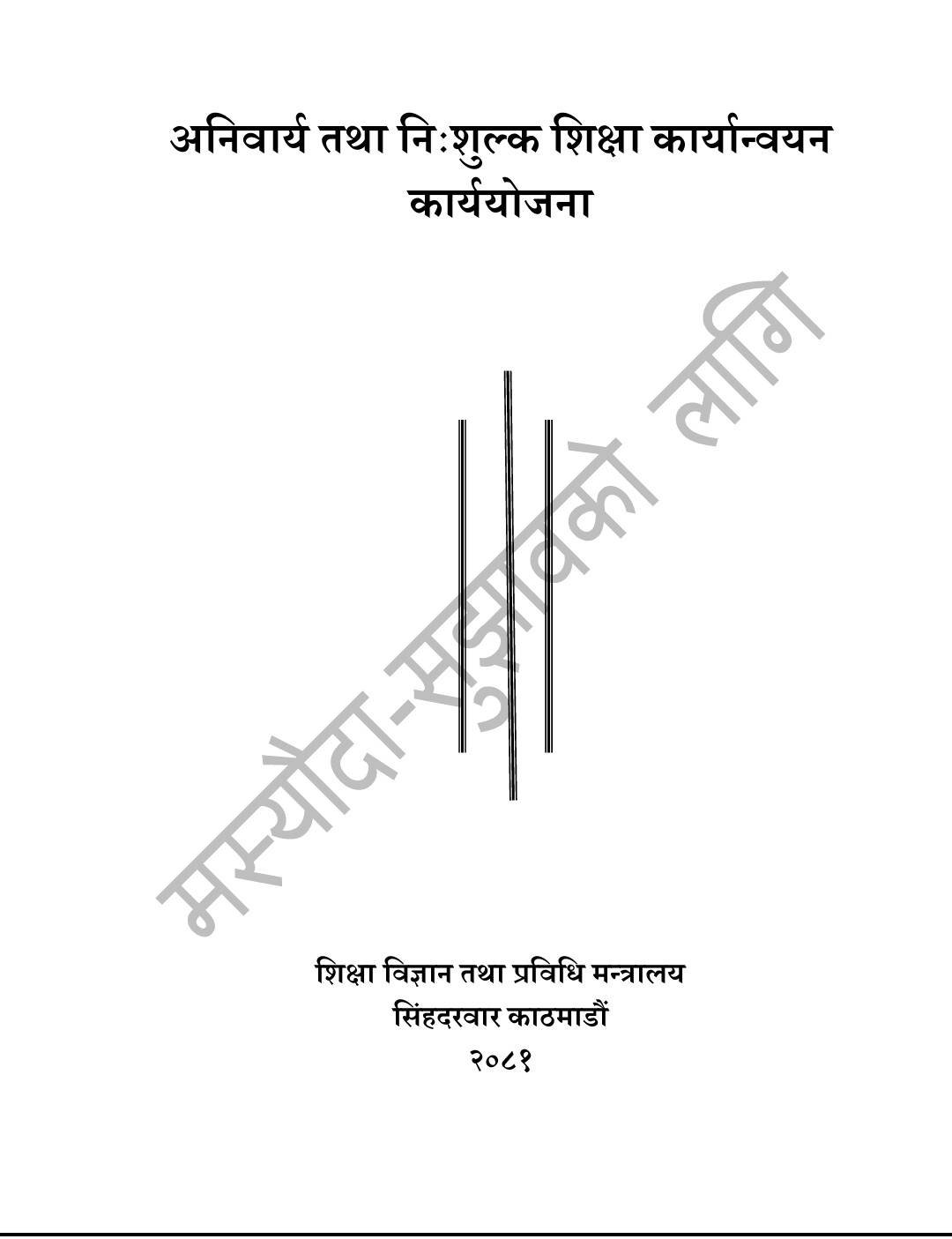 शिक्षा, विज्ञान तथा प्रविधि मन्त्रालयले ‘अनिवार्य तथा निःशुल्क शिक्षा कार्यान्वयन कार्य योजना, २०८१’ को मस्यौदा बनाएर सरोकारवालासँग सुझाव माग गरेको छ । निःशुल्क शिक्षा कार्यान्वयनका लागि प्रमुख १५ वटा रणनीति र १५ वटा प्रमुख कार्यहरू राखेर मन्त्रालयले सरोकारवालासँग आवश्यक सुझाव मागेको हो ।