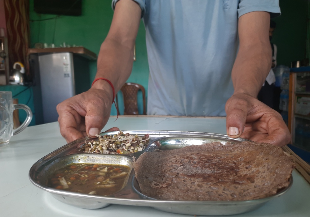 सुरुमा आँटाको सुक्खा रोटी बेच्न थाले । रोटीमा ग्राहकहरू पल्किन थाले । त्यसपछि उनले आँटाको साटो कोदो, फापर ल्याए । मोही थपे, टुसा पलाएको गेडागुडीको तरकारीसँगै कोदो, फापरको रोटीका साथमा गुन्द्रुकको चट्नी पनि समेटियो । अनि मूल्य राखियो, ५० रुपैयाँ । चना र जौको सातु, मकैको भात पनि सुरु गरे । अंकुरिएका गेडागुडी मेथी, मुङ दाल, चना, पहाडे केराउको चटपटे । ‘रैथाने खाजा सुरु गरेपछि व्यापार खस्केला भन्ने डर थियो,’ काजीले सुनाए, ‘तर व्यापार पहिलाभन्दा तेब्बर बढेर पो गयो ।’