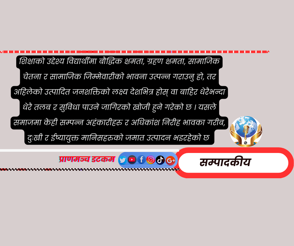 देश, समाज र मानवताप्रतिको सचेत दायित्व बोक्न अग्रगामी ज्ञानको आवश्यकता हुन्छ । ज्ञान साक्षर भएर मात्र प्राप्त हुँदैन, यसको निम्ति शिक्षित हुनुपर्छ । शिक्षित र अनुशासित तप्काको जमघट बलियो भयो भने मात्र देशमा साँचो अर्थको विकास र समृद्धिको जग बसाल्न सकिन्छ । हिजोआजको नाफाखोर बजारले विद्यार्थी र समाजमा पैसाबाहेक सब कुरा भ्रम हो भन्ने गलत भाष्य खडा गरेको छ । संविधानले देशमा सबैको निम्ति निःशुल्क शिक्षा भनेपनि निजी स्कूलमा त यो कुरा सम्भव नै भएन, सरकारी स्कुलमा समेत विभिन्न निहुँमा विद्यार्थीबाट रकम असुल्ने गरिन्छ । देशका बहुसंख्यक जनताका छोराछोरीले पढ्ने सामुदायिक स्कुलहरुमा गुणात्मक शिक्षाको अभाव छ । शिक्षकहरुको सामाजिक दायित्वको चेतनाको अभाव र जागिरे मानसिकता अर्को गम्भीर समस्या छ । अझ राज्यको टालटुले र भ्रष्ट व्यवस्थापन सबैभन्दा गम्भीर समस्या हो ।