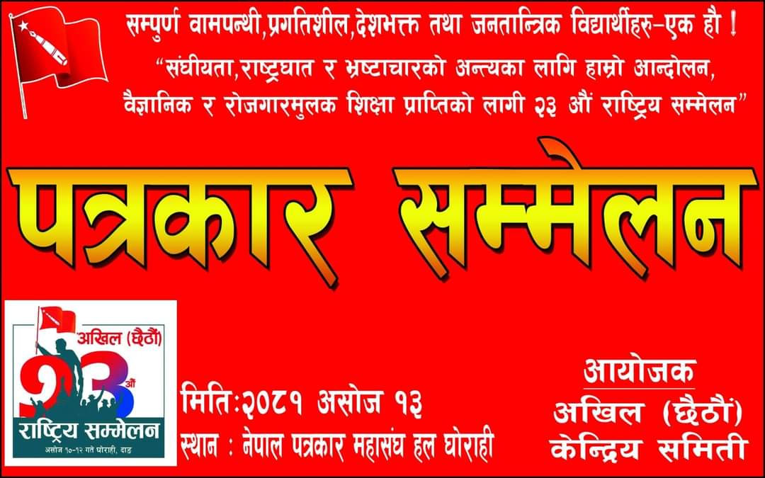 संगठनका केन्द्रीय अध्यक्ष सुवाष जिसीले प्रेस वक्तव्य प्रस्तुत गर्दै संगठनको यही असोज १० देखि १२ गतेसम्म दाङको घोराहीमा सम्पन्न भएको २३ औं राष्ट्रिय सम्मेलनले ३५ सदस्यीय केन्द्रीय समितिसहित राष्ट्रिय परिषद् सदस्य सर्वसम्मत निर्वाचित भएको जानकारी दिए । उनले सम्मेलनबाट विभिन्न १० बुँदे विशेष प्रस्ताव पारित गरेको बताए । उनले शिक्षा क्षेत्रमा व्याप्त सबैखाले बेथितिसँगै संघीयता, राष्ट्रघात र भ्रष्टाचार अन्त्यका लागि संगठनले थप प्रभावकारी कार्ययोजना बनाएर संघर्ष गरिने प्रतिबद्धता व्यक्त गरे ।