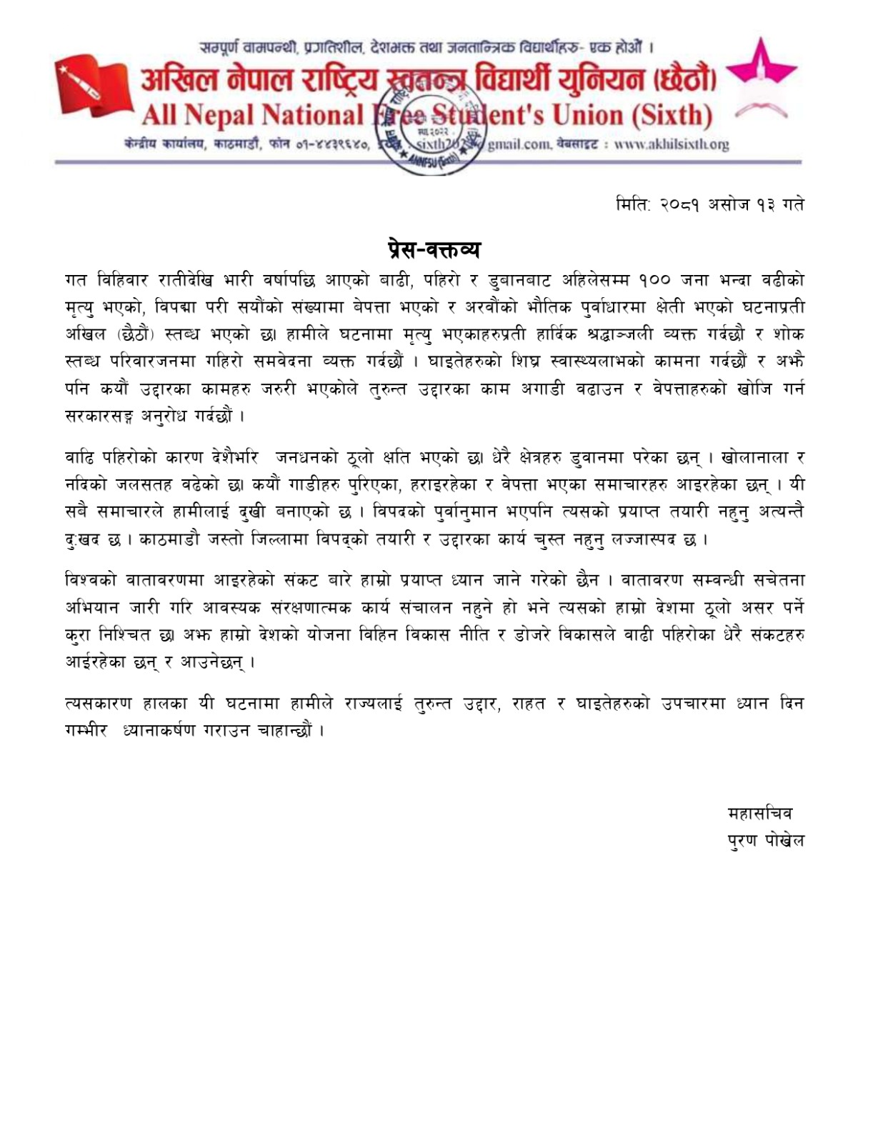 त्यस्तै संगठनका महासचिव पुरण पोख्रेलले गत बिहीबार रातिदेखि भारी वर्षापछि आएको बाढी, पहिरो र डुबानबाट भएको मानवीय क्षति र भौतिक पूर्वाधारमा भएको क्षेति र घटनाप्रति अखिल (छठौं) स्तब्ध भएको बताए । उनले विपद्को पूर्वानुमान भएपनि त्यसको पर्याप्त तयारी नहुनु अत्यन्तै दुःखद् भएको बताउँदै काठमाडौं जस्तो जिल्लामा विपद्को तयारी र उद्दार कार्य चुस्त नहुनु दुखद भएको बताए । जलवायु परिवर्तनको असरले विश्वको वातावरणमा आइरहेको संकटबारे हाम्रो प्रयाप्त ध्यान नजानु र यसबारे सरकारकाे सचेतना अभियान नचालिनु पनि दुखद भएको उनेले बताए । साथै उनले यो प्राकृतिक विपत्तिमा राहत तथा उद्दार कार्यमा खट्न देशभरका आफ्ना संगठन लाग्ने बताए ।