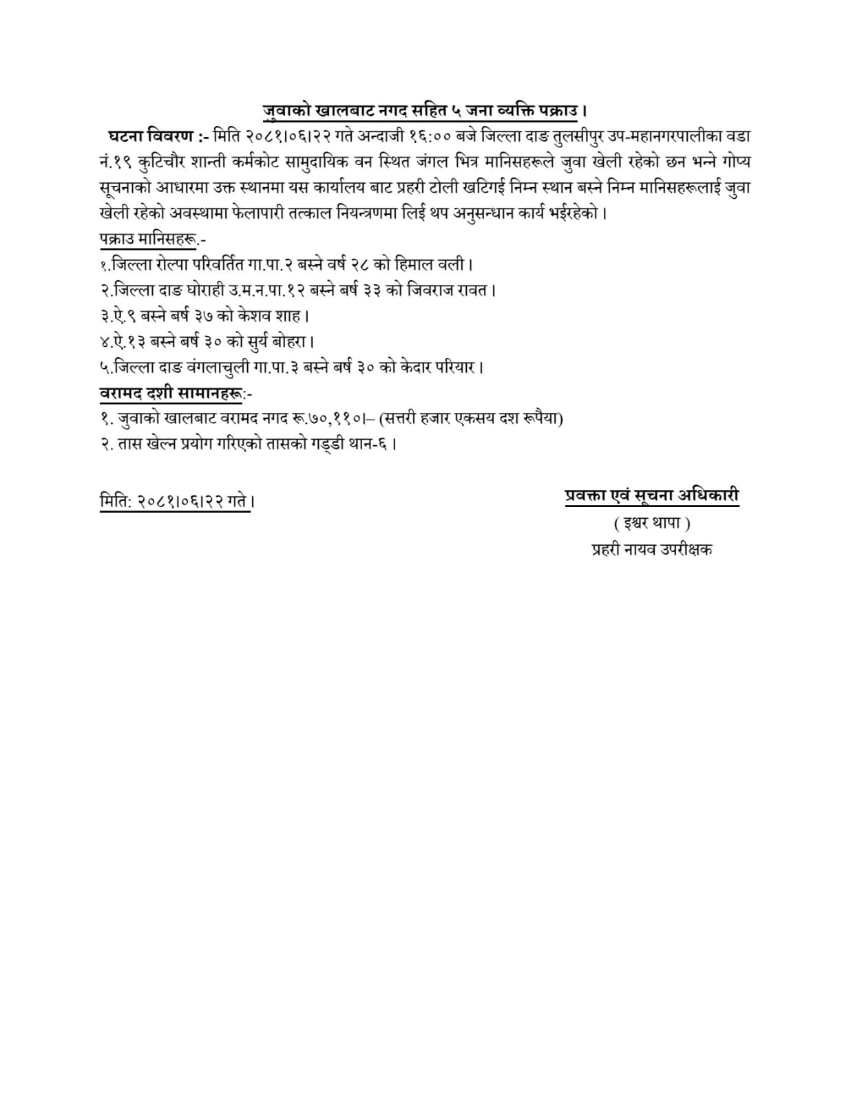 तुलसीपुर उप-महानगरपालिका १९ कुटिचौर शान्ती कर्मकोट सामुदायिक वन स्थित जंंगलमा तास खेलिरहेको अवस्थामा फेला पारी रु ७० हजार १ सय १० नगदसहित पाँच जनालाई प्रहरिले पक्राउ गरेको जिप्रका दाङका प्रवक्ता तथा सुचना अधिकारी प्रहरी नायव उपरीक्षक ईश्वर थापाले जानकारी दिए ।