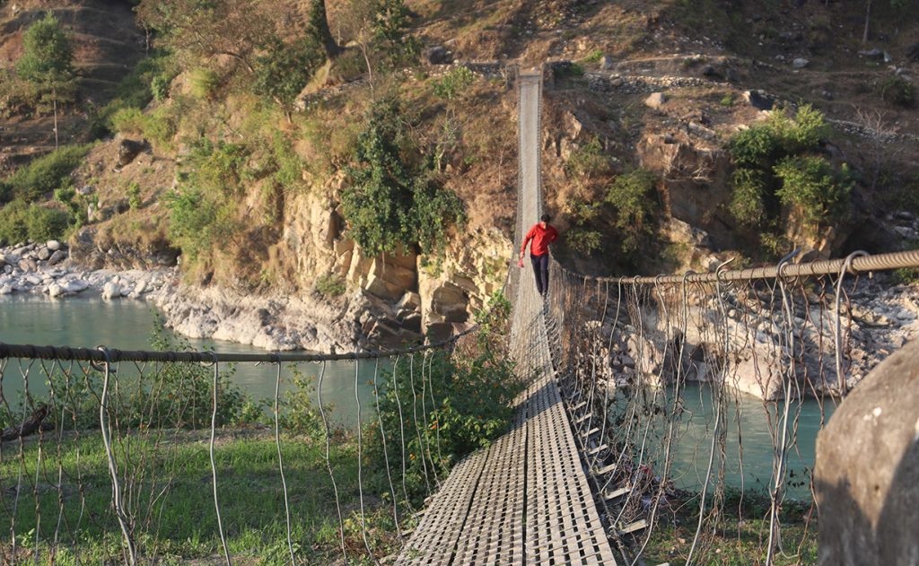 ६ महिना अघि खच्चड फसेको कर्णाली नदीको झोलुङ्गे पुल अझै मर्मत हुन सकेको छैन । स्थानीयबासी त्यही जोखिमपूर्ण अवस्थाको जीर्ण पुलमा आवतजावत गर्न बाध्य छन् ।