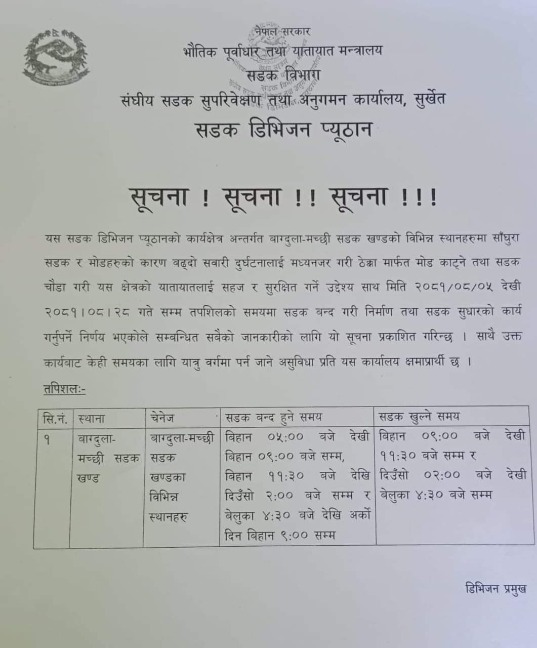 बाग्दुला – मच्छि सडक खण्डको विभिन्न स्थानहरूमा साँघुरा सडक र मोडहरु चौडा गर्नु पर्ने भएको हुँदा उक्त सडक खण्ड आजदेखी मंसिर २८ गते सम्म बन्दहुने सडक डिभिजन कार्यालय प्युठानले जनाएको छ ।