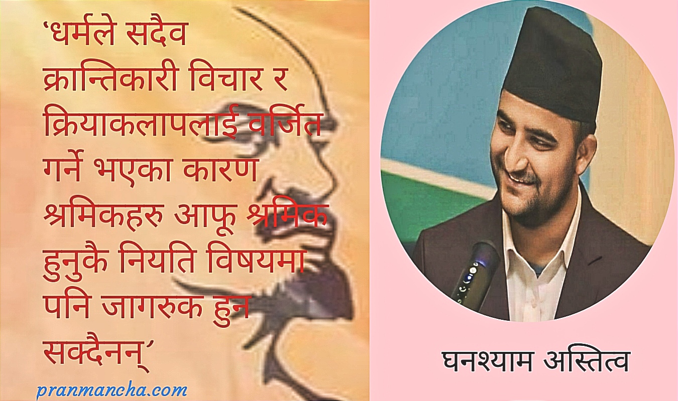 पूँजीपतिहरु धर्मलाई महत्वपूर्ण अस्त्रका रुपमा प्रयोग गरेर श्रमिक वर्गमाथि शोषण गरिरहेका छन् । उनीहरुले यस्तो किसिमको भ्रामक विश्वासको सिर्जना गरेका छन् कि मालिकमाथि प्रश्न गर्नु र विद्रोह गर्नु एक महापाप हो । एउटा मालिक बन्नु र अर्को दास बन्नुमा यहाँ कसैको भूमिका छैन, अघिल्लो जन्ममा गरेका कामहरुको फल हो भन्ने चिन्तन श्रमिकहरुमा थोपरेर उनीहरु श्रमिक वर्गमाथि शोषण गरिरहेका हुन्छन् । यही चिन्तनको त्याग गर्दै, यही विश्वासलाई अस्वीकृत गर्दै माथि उठ्नु नै श्रमिक वर्गको विजयको सुरुआत हो ।