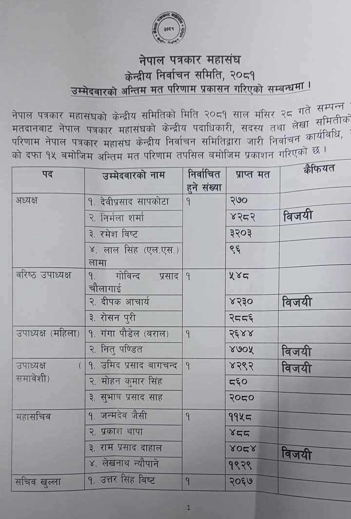 निर्वाचन गत मंसिर २८ मा भएको थियो । नवनिर्वाचित अध्यक्ष शर्मा प्रेस चौतारी नेपाल र नेपाल प्रेस युनियनको समर्थनमा प्यानलबाट सर्वसम्मत उम्मेदवार भएकी हुन् ।