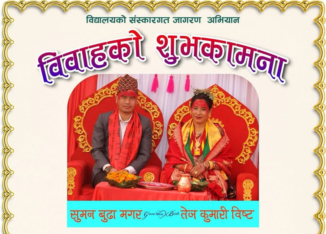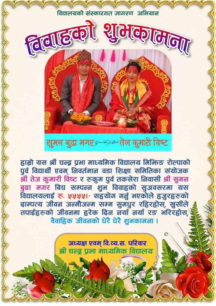 जीवनको यात्रामा विवाह केवल दुई व्यक्तिहरूको मिलन मात्र नभई विश्वास, सम्मान, स्नेह र आत्मीयताको सुन्दर बन्धन हो। यही आत्मीय भावनासहित श्री चन्द्र प्रभा माध्यमिक विद्यालय, मिझिङ, रोल्पा का पूर्व विद्यार्थी, निवर्तमान वडा सदस्य तथा वडा शिक्षा समितिका संयोजक श्रीमती तेज कुमारी विष्ट र रुकुम पूर्व, तकसेरा निवासी श्री सुमन बुढा मगर बीच सम्पन्न शुभ विवाह को पावन अवसरमा विद्यालयलाई रु. ५५५५।- आर्थिक सहयोग प्रदान गरिएको छ।