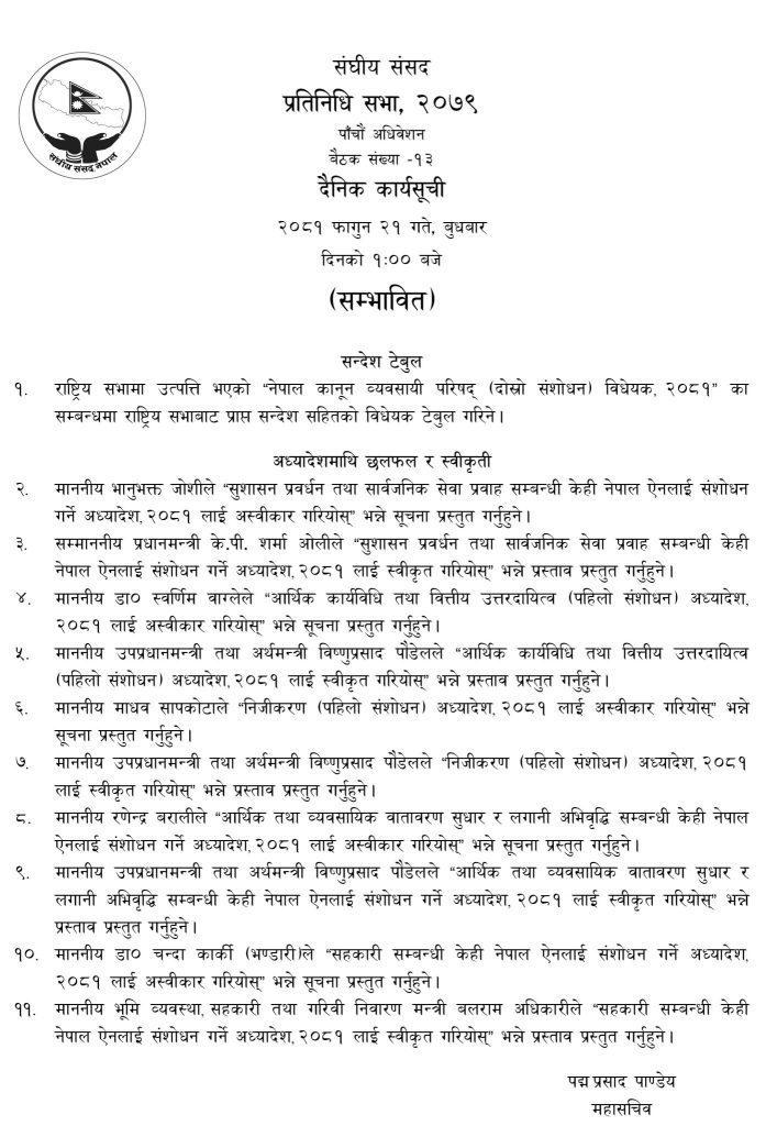 यी ६ वटै अध्यादेश गत माघ १८ गते दुवै सदनमा पेस भइसकेका छन् । यसमध्ये आज बस्ने प्रतिनिधि सभाको बैठकबाट पाँच वटा अध्यादेश स्वीकृत गराउने र प्रतिस्थापन विधेयक ल्याउने सरकारको तयारी छ ।