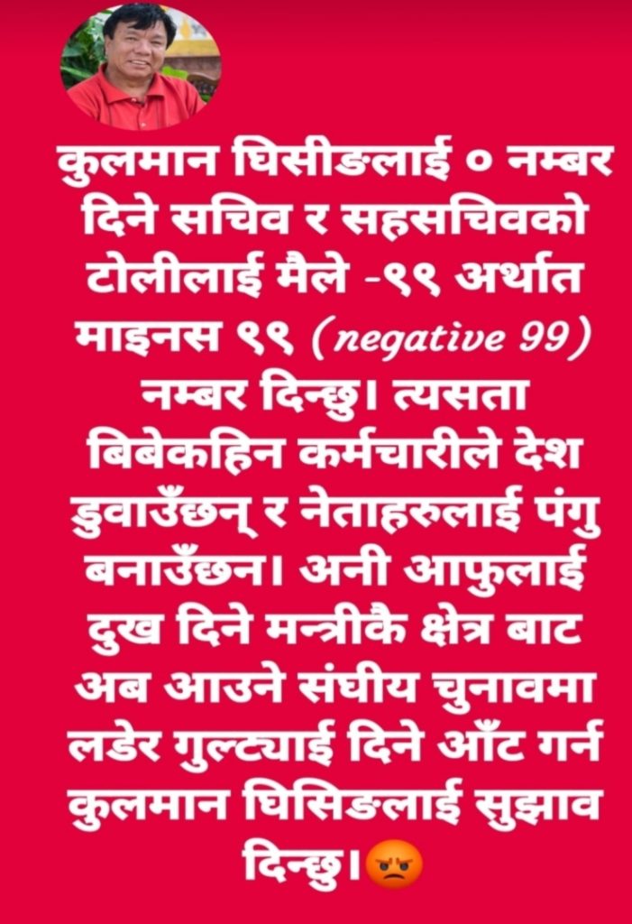उनले घिसिङलाई ० नम्बर दिने सचिव र सहसचिवको टोलीलाई आफूले ९९ अर्थात माइनस ९९ नम्बर दिन्छु भन्दै आक्रोश पोखेका छन्। पुनले लेखेका छन्, ‘कुलमान घिसिङलाई ० नम्बर दिने सचिव र सहसचिवको टोलीलाई मैले ९९ अर्थात माइनस ९९ (negative 99) नम्बर दिन्छु।’