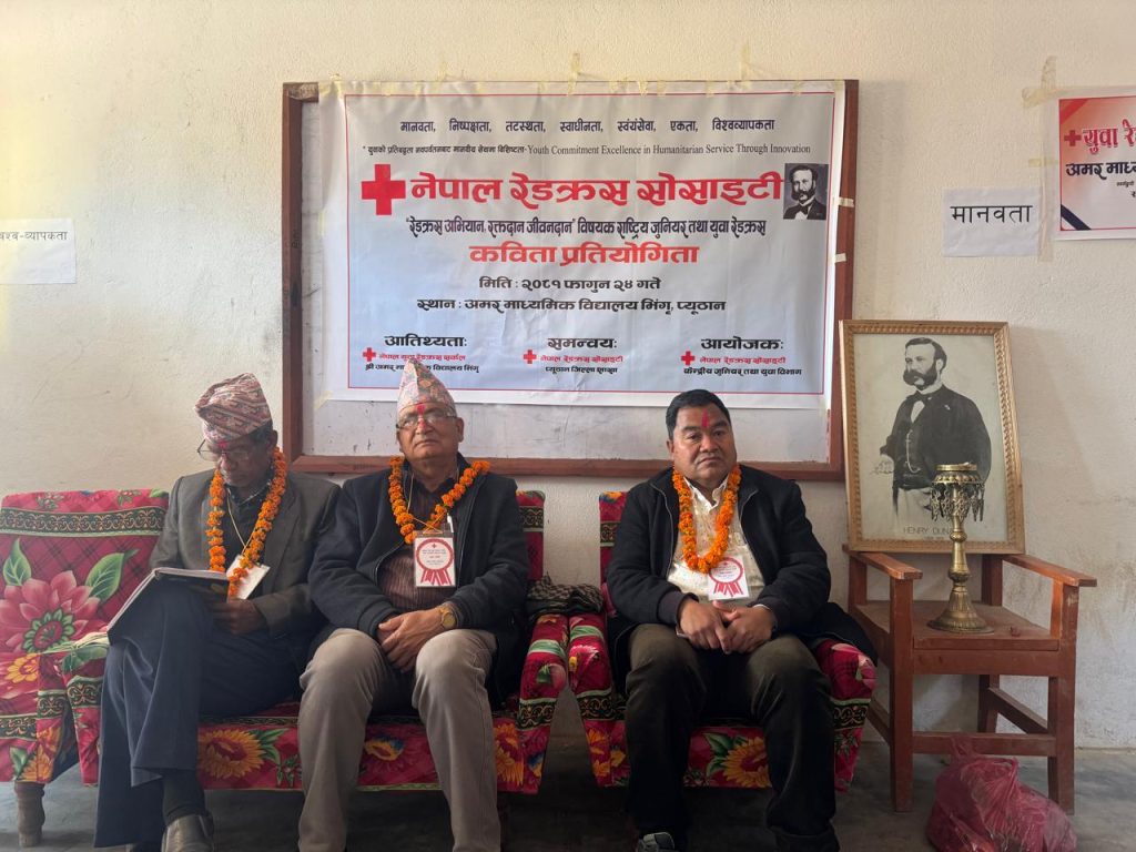 नेपाल रेडक्रस सोसाइटीको केन्द्रीय जुनियर तथा युवा विभागको आयोजनामा भएको “रेडक्रस अभियान, रक्तदान जीवनदान” विषयक विद्यालय स्तरीय राष्ट्रिय कविता प्रतियोगिता अमर माध्यमिक विद्यालय, भिङ्ग्री, प्यूठानमा भव्य रूपमा सम्पन्न भएको छ।