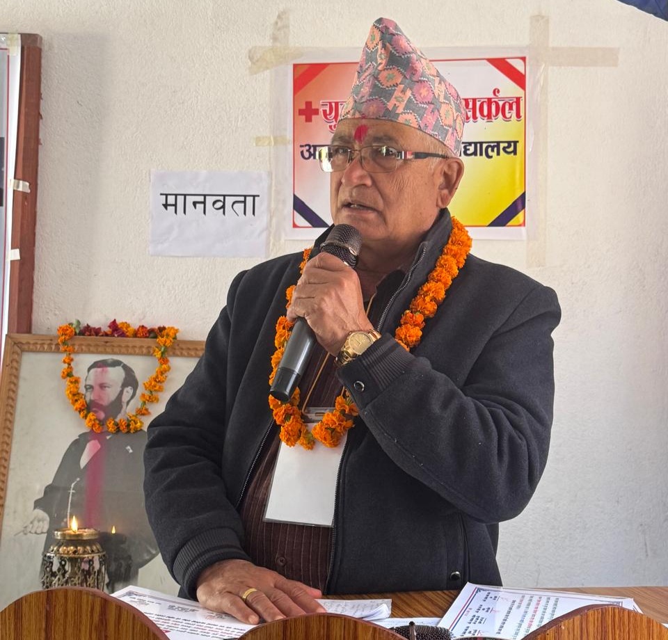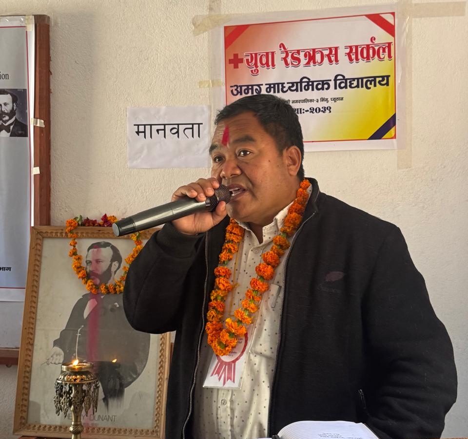 कार्यक्रमका विशेष अतिथि नेपाल रेडक्रस सोसाइटीका केन्द्रीय सदस्य तथा प्यूठान जिल्ला सभापति गुमानराज पुलामीले रेडक्रसको ऐतिहासिक पृष्ठभूमि र यसका संस्थापक जा हेन्ड्री ड्युनाँको जीवनीबारे प्रकाश पारेका थिए। उनले आफ्नो मन्तव्यमा रेडक्रसको स्थापना सन् १८६३ मा स्विजरल्यान्डको जिनेभा शहरमा भएको जानकारी दिए। रेडक्रस स्थापनाको प्रेरणा सन् १८५९ को सोल्फेरिनो युद्धमा घाइते सैनिकहरूको दुःखद अवस्था रहेकाले हेनरी ड्युनाँले मानवीय सहायता संगठन स्थापनाको अवधारणा अघि सारेको उल्लेख गरे। साथै, सन् १८६४ मा आयोजित जेनेभा सम्मेलनपछि रेडक्रसलाई औपचारिक मान्यता दिइएको र हाल रेडक्रस १९० भन्दा बढी देशहरूमा सक्रिय रहेको जानकारी दिए।