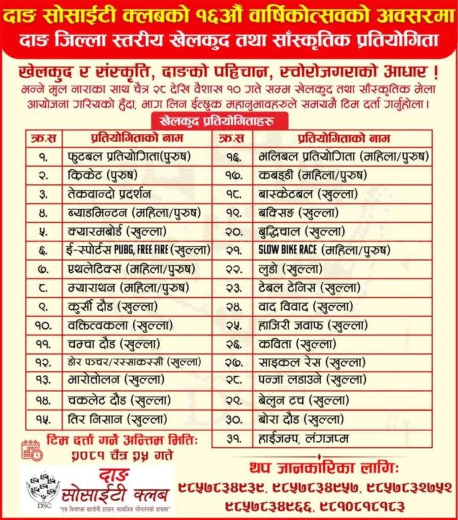 आयोजक दाङ सोसाइटी क्लवले विहीवार घोराहीमा पत्रकार सम्मेलनको आयोजना गरेर प्रतियोगिताका बारेमा जानकारी गराएको छ । १३ दिनसम्म सञ्चालन हुने प्रतियोगितामा विभिन्न विधाका ३७ वटा खेलहरु सञ्चालन हुने भएको दाङ सोसाइटी क्लवका अध्यक्ष लेखनाथ बुढाथोकीले जानकारी दिएका छन् । अध्यक्ष बुढाथोकीका अनुसार प्रतियोगितामा फुटबल र क्रिकेटमा पुरुष र भलिवल, कवडी, मिनी म्याराथन, ब्याडमिन्टन, एथलेटिक्स र स्लो बाइक तथा स्कुटी प्रतियोगितामा महिला र पुरुषले प्रतिष्पर्धा गर्न पाउने भएका छन् ।