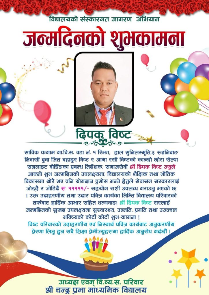 समाजसेवा र शिक्षाप्रति समर्पित व्यक्तित्व दिपक विष्टले आफ्नो जन्मदिनको अवसरमा श्री चन्द्रप्रभा माध्यमिक विद्यालयलाई आर्थिक सहयोग प्रदान गरेका छन्। विद्यालयको शैक्षिक तथा भौतिक विकासमा योगदान पुर्याउने उद्देश्यले उनले रु ११,१११/- (एघार हजार एक सय एघार) सहयोग राशी उपलब्ध गराएका हुन् ।
