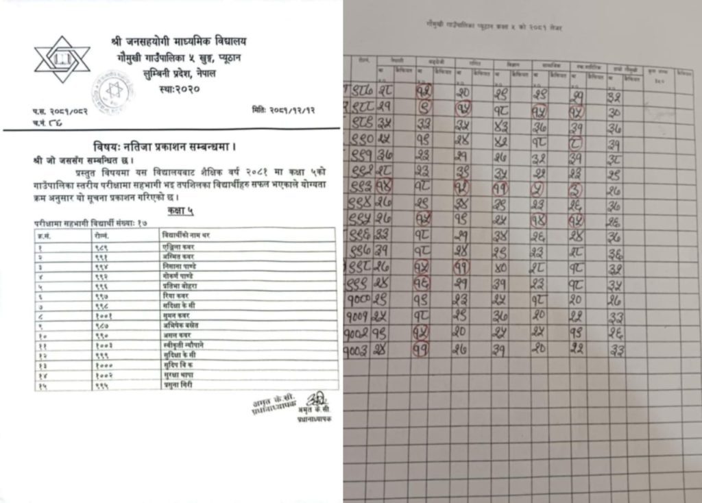 जाँचकले प्रदान गरेकाे प्राप्ताङ्ककाे “लेजर” र जनसहयाेगी माविका प्रअले आफूखुसी इन्ट्री गरेकाे विद्यार्थीकाे नतिजा