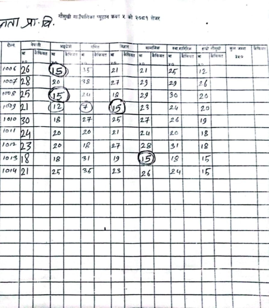 गत साेमबार गाैमुखी गाउँपालिकाकाे कक्षा ८ र ५ काे अन्तिम नतिजा सार्वजनिक भएसँगै नतिजाकाे विश्वश्नियतामाथि व्यापक प्रश्न र आशंकासहित विराेध चलिरहेकाे छ । नतिजा हेरफेर गरेर अनुत्तीर्ण विद्यार्थी पास गराउने पालिकाकाे परीक्षा समिति र त्यसका हर्ताकर्ता सदस्य अमृतबहादुर केसीकाे बदमासीले सीमा नाघेकाे छ । कक्षा ५ काे लेजरमा जम्मा ८ जना विद्यार्थी मात्रै उत्तीर्ण भएका तर जनसहयाेगी माध्यमिक विद्यालयबाट सहभागी भएका १७ जनामध्येबाट १५ जनालाई उत्तीर्ण गराइएको पाएपछि हामीले आज पालिकामा नतिजाकाे आँकडा हेर्दा परीक्षा समितिले जनसहयाेगी माविका कक्षा ८ मा अनुत्तीर्ण थप ६ जना र जनता प्रावि सुन्दरमेलाका ३ जना अनुत्तीर्ण विद्यार्थीलाई शिक्षा शाखा प्रमुख दुर्गा सुवेदी र जनसहयाेगी माविका प्रधानाध्यापक अमृतबहादुर केसीकाे मिलेमताेमा टिपेक्स लगाएर र केरमेट गरेर नम्बर थपि पास गराएकाे पाइयाे । त्यस्तै जनता प्राविकाे नतिजामा पनि ५ जना मात्रै उत्तीर्ण भएको भएपनि कम्प्युटर प्रविष्ट गर्दा तीन जना विद्यार्थीलाई आफूखुसी नम्बर चढाएर पास गराइएकाे पाइएकाे हाे । साे विषयमा विद्यालयका प्रधानाध्यापक अन्जु एमसीले आफ्नाे विद्यालयबाट ५ जनासम्म पास हुने आँकलन गरिएकाे भएपनि संयाेगवस ८ जना विद्यार्थी पास भएको कुरा स्वीकार्दै बाँकी परीक्षा शाखाकाे बदमासीकाे विषयमा आफूलाई कुनै जानकारी नभएको बताइन् ।