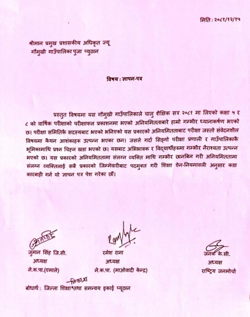 गौमुखी गाउँपालिकाले चालु शैक्षिक सत्र २०८१ मा लिएको कक्षा ५ र ८ को वार्षिक परीक्षाको परीक्षाफल प्रकाशनमा भएको अनियमितताबारे एमालेसहित तीन राजनीतिक दलहरुले आपत्ति जनाएका छ।