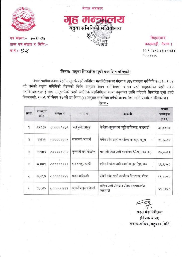 गृह मन्त्रालयले नेपाल प्रहरीका ६ जना प्रहरी नायब महानिरीक्षक (डीआईजी) लाई प्रहरी अतिरिक्त महानिरीक्षकमा बढुवा गर्न सिफारिस गरेको छ ।