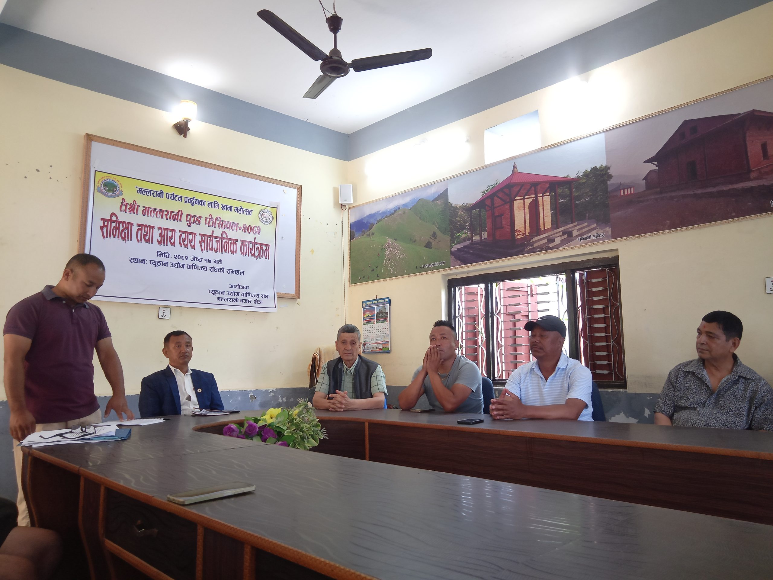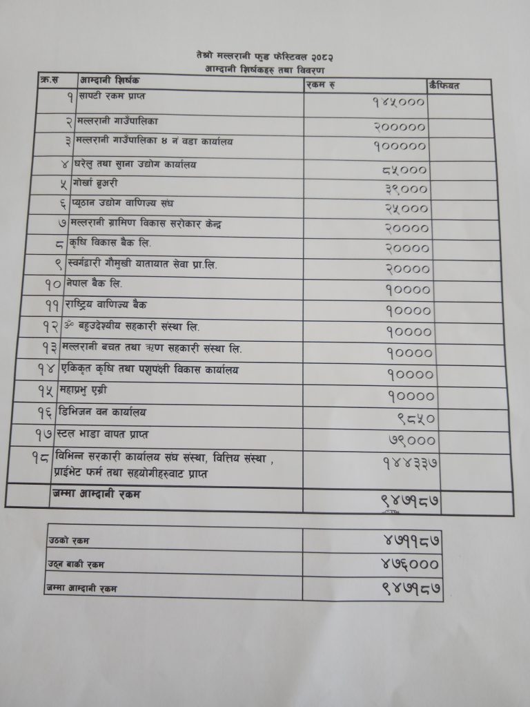 तेस्रो मल्लरानी खाना महाेत्सवकाे आम्दानी-खर्च सार्वजनिक गरिएको छ । मल्लरानी पर्यटन प्रवर्द्वनका लागि २०८१ चैत ३१ गते देखि २०८२ बैशाख २ गते सम्म संञ्चालन गरिएको महाेत्सवकाे आय ब्यय शनिबार एक कार्यक्रमका बिच सार्वजनिक गरिएकाे हाे ।
