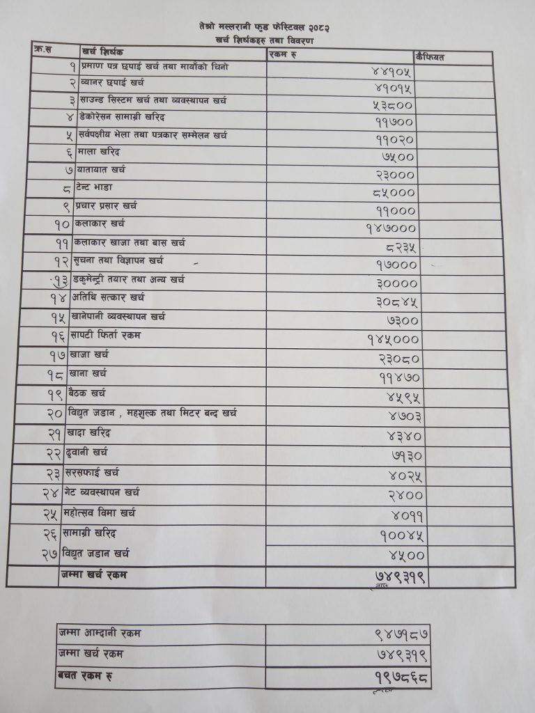 केही रकम उठ्न बाँकी रहेको जानकारी दिदै महोत्सवको कुल खर्च कटाएर १ लाख ९७ हजार ८ सय ६८ रुपैयाँ बचर रहने उनले बताए ।