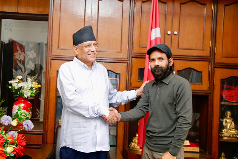 सुर्खेतबाट खाली खुट्टा हिँडेर काठमाडौं आइपुगेका अभियानकर्मी नवराज बोहराले माओवादी केन्द्रका अध्यक्ष पुष्पकमल दाहाललाई भेट गरेका छन्।