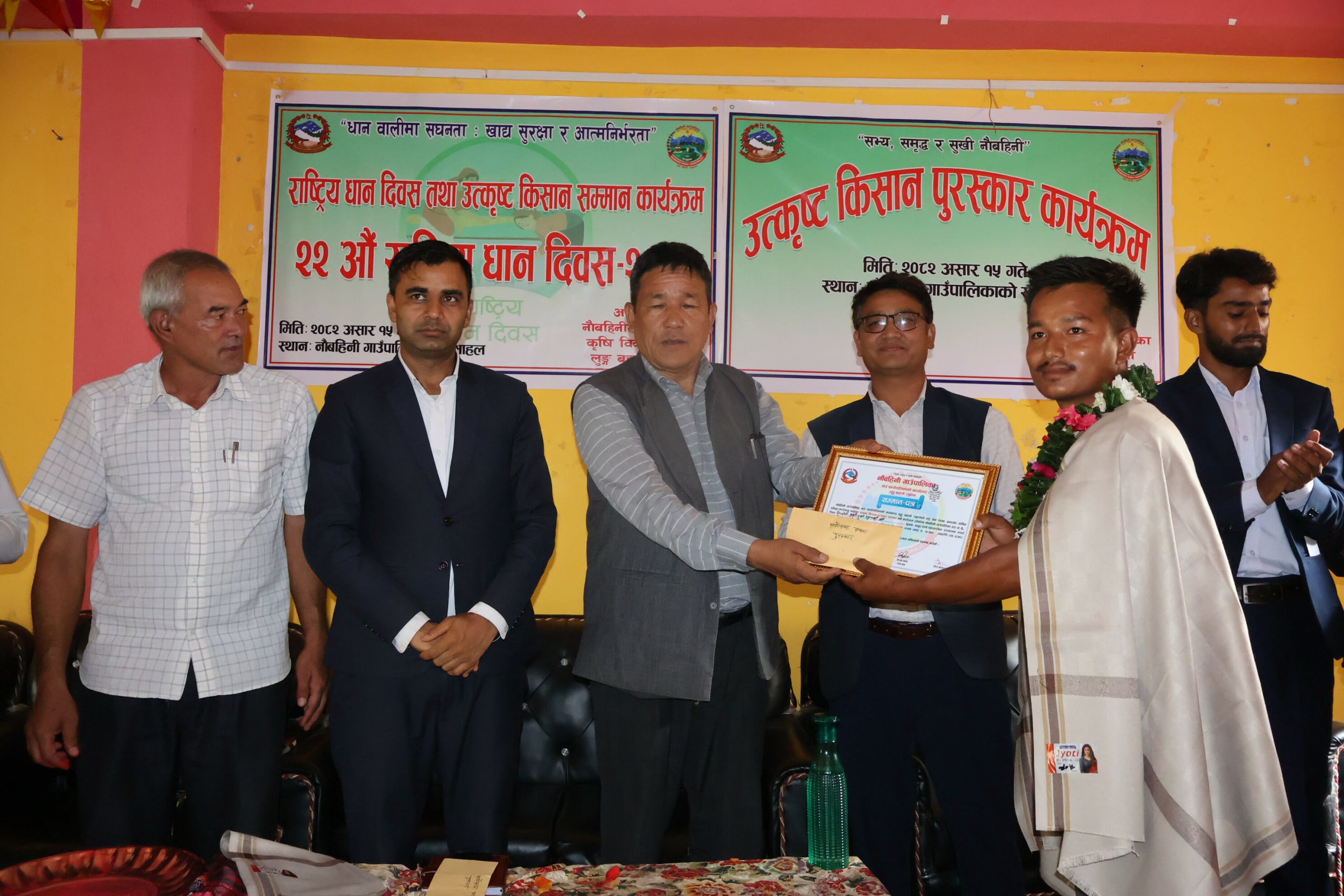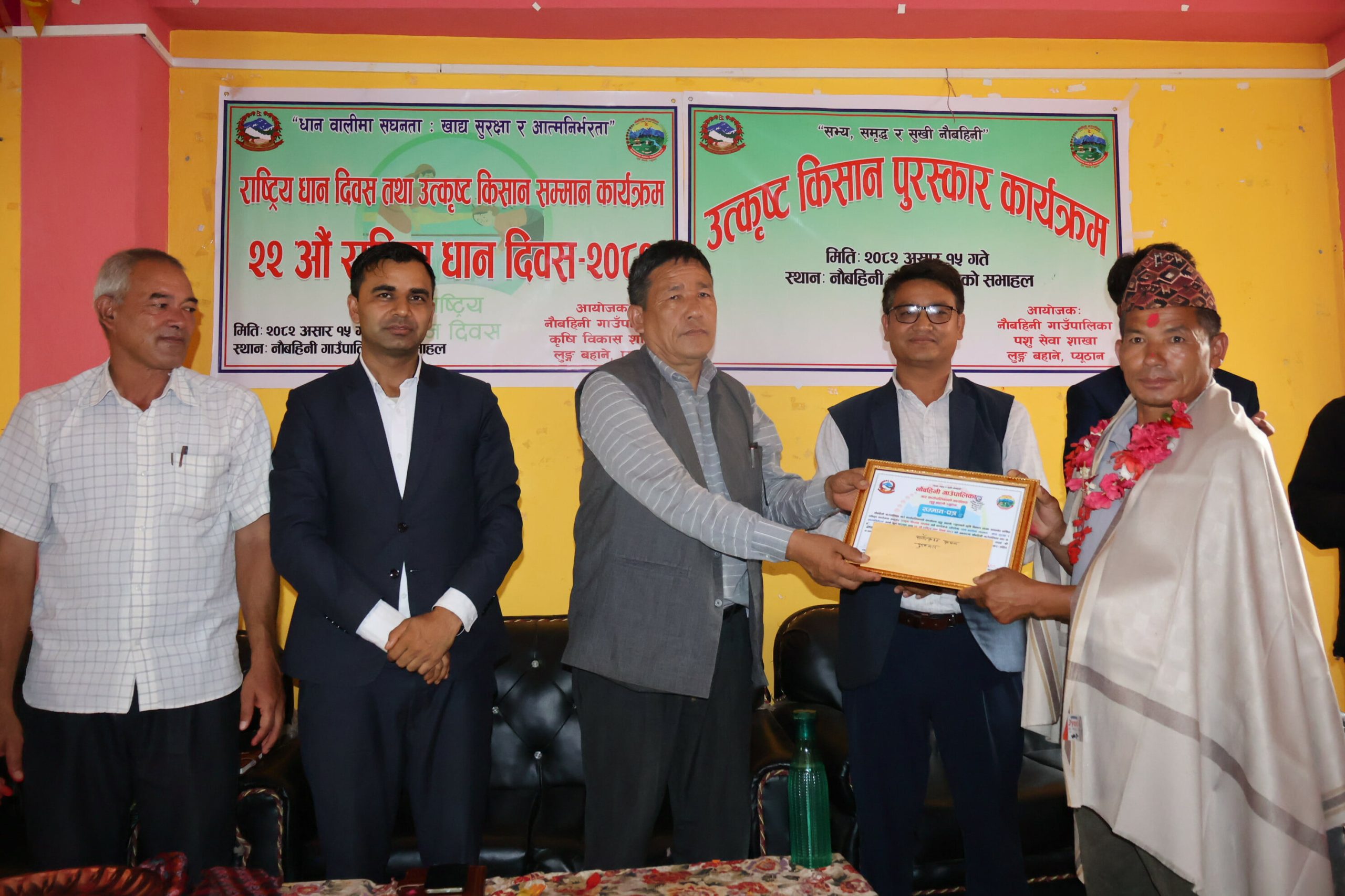 नौबहिनी गाउँपालिकाले उत्कृष्ट किसानहरुलाई सम्मान गरेको छ । गाउँपालिकाले २२ औं राष्ट्रिय धान दिवस २०८२ तथा असार १५ दहि चिउरा खाने दिनको अवसर परेर कार्यक्रमको आयोजना गरेर उत्कृष्ट किसानहरुलाई नगद सहित सम्मान गरेको हो ।