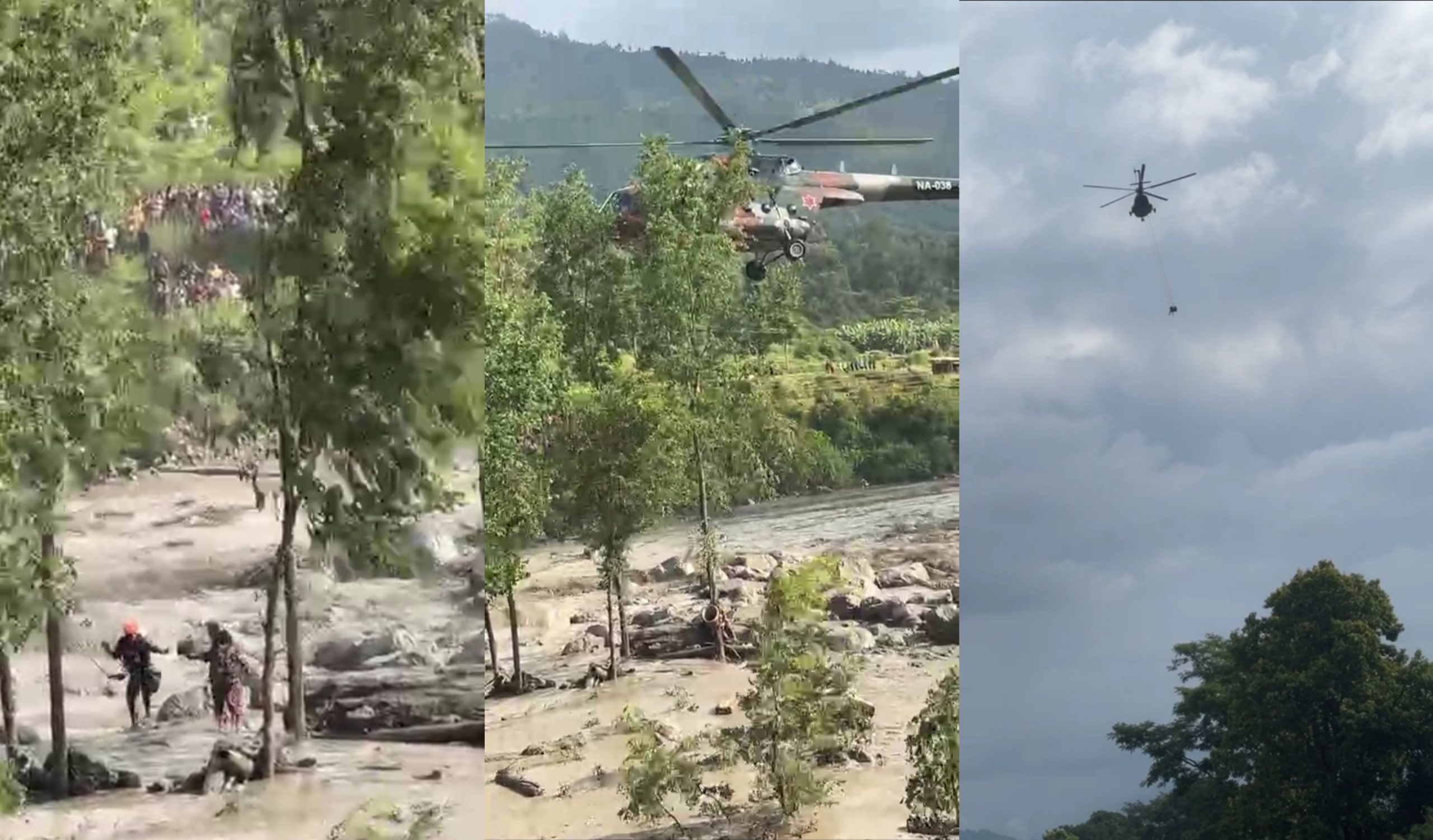 नुवाकोटस्थित त्रिशूली नदीमा फसेका दुई जनाको हेलिकप्टरबाट उद्धार गरिएको छ ।