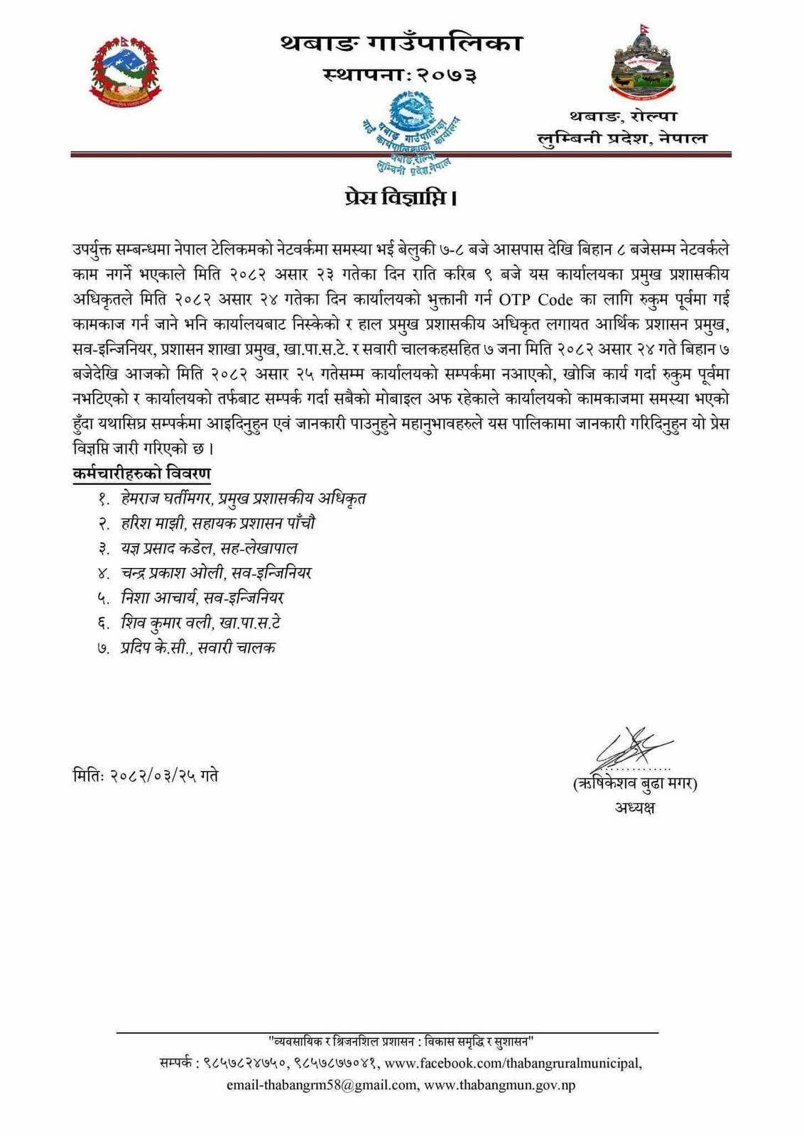 गाउँपालिकाले विज्ञप्तिमा भनेको छ — “कार्यालयको कामकाजमा समस्या भइरहेको हुँदा यथासिघ्र सम्पर्कमा आइदिनुहुन अनुरोध गरिन्छ । साथै, जानकारी पाउनुहुने महानुभावहरूले समेत गाउँपालिकालाई जानकारी गराइदिनुहुन अनुरोध छ ।”