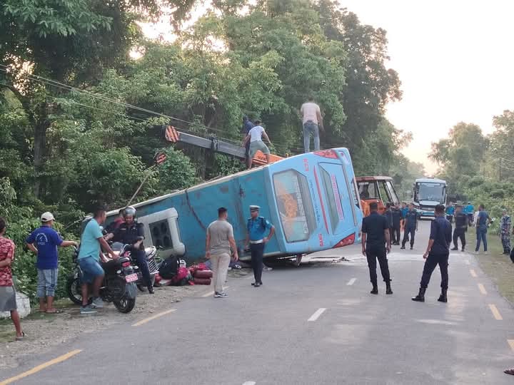 दुर्घटनापछि सडक एकतर्फीमात्रै सञ्चालन भएको छ । बस हटाउने पहल भइरहेको छ ।