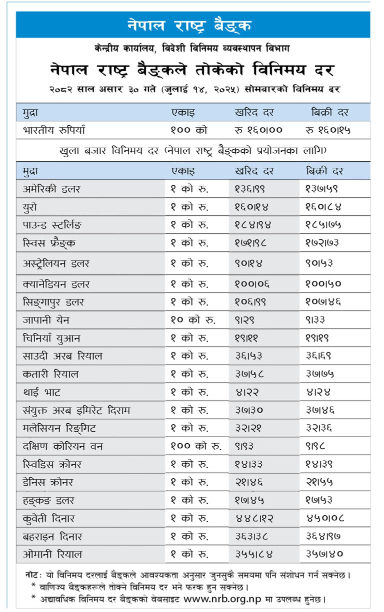 नेपाल राष्ट्र बैंकले आजका लागि तोकेको विदेशी मुद्राको विनिमय दर अनुसार अमेरिकी डलरको भाउ स्थिर छ । युरो केही बढ्दा पाउण्ड स्टर्लिङ भने घटेको छ ।