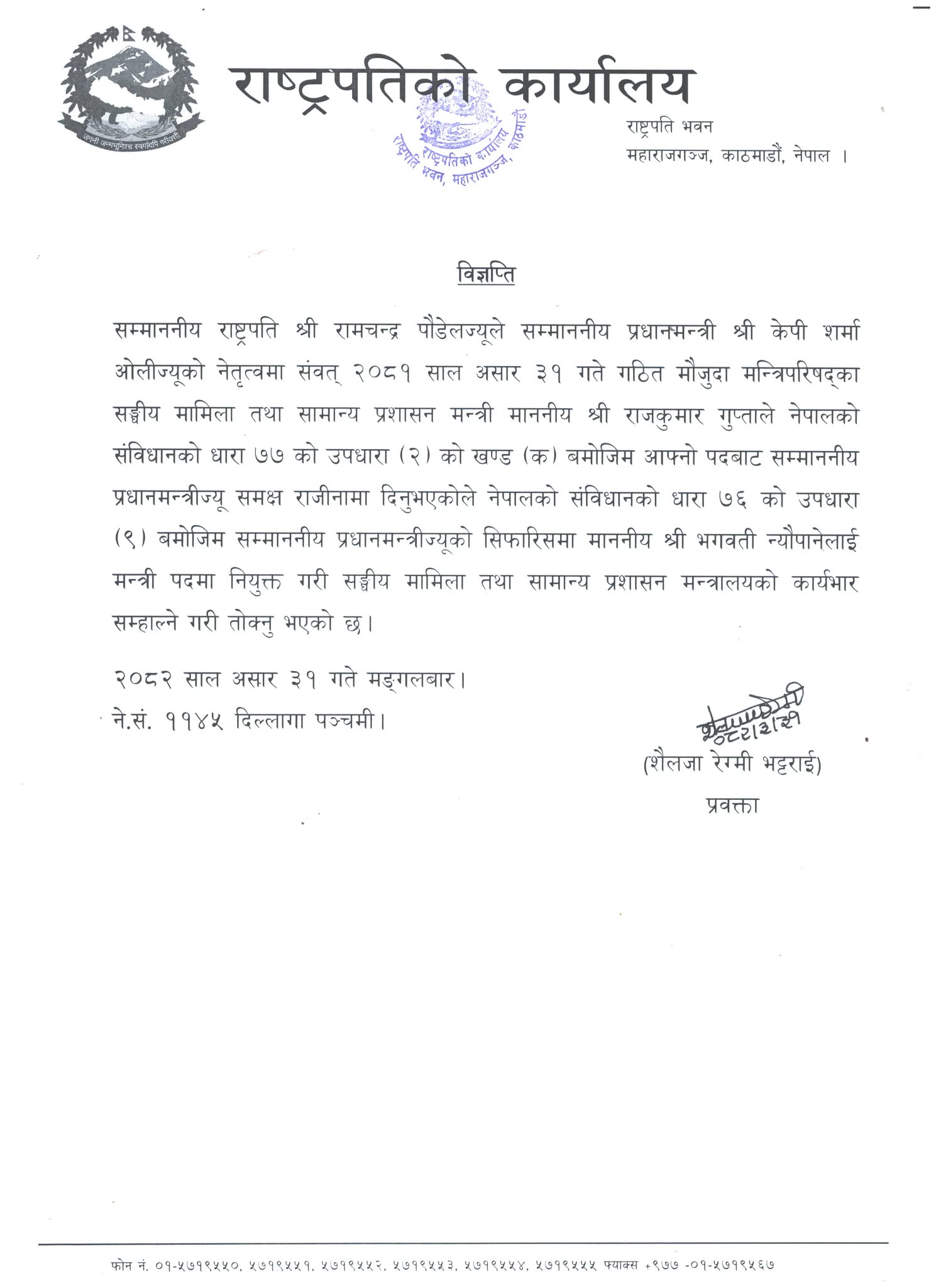 राष्ट्रपति कार्यालयले विज्ञप्ति निकालेर न्यौपानेले संघीय मामिला तथा सामान्य प्रशासन मन्त्रालयको कार्यभार सम्हाल्ने जिम्मेवारी पाएको जानकारी दिएको छ।
