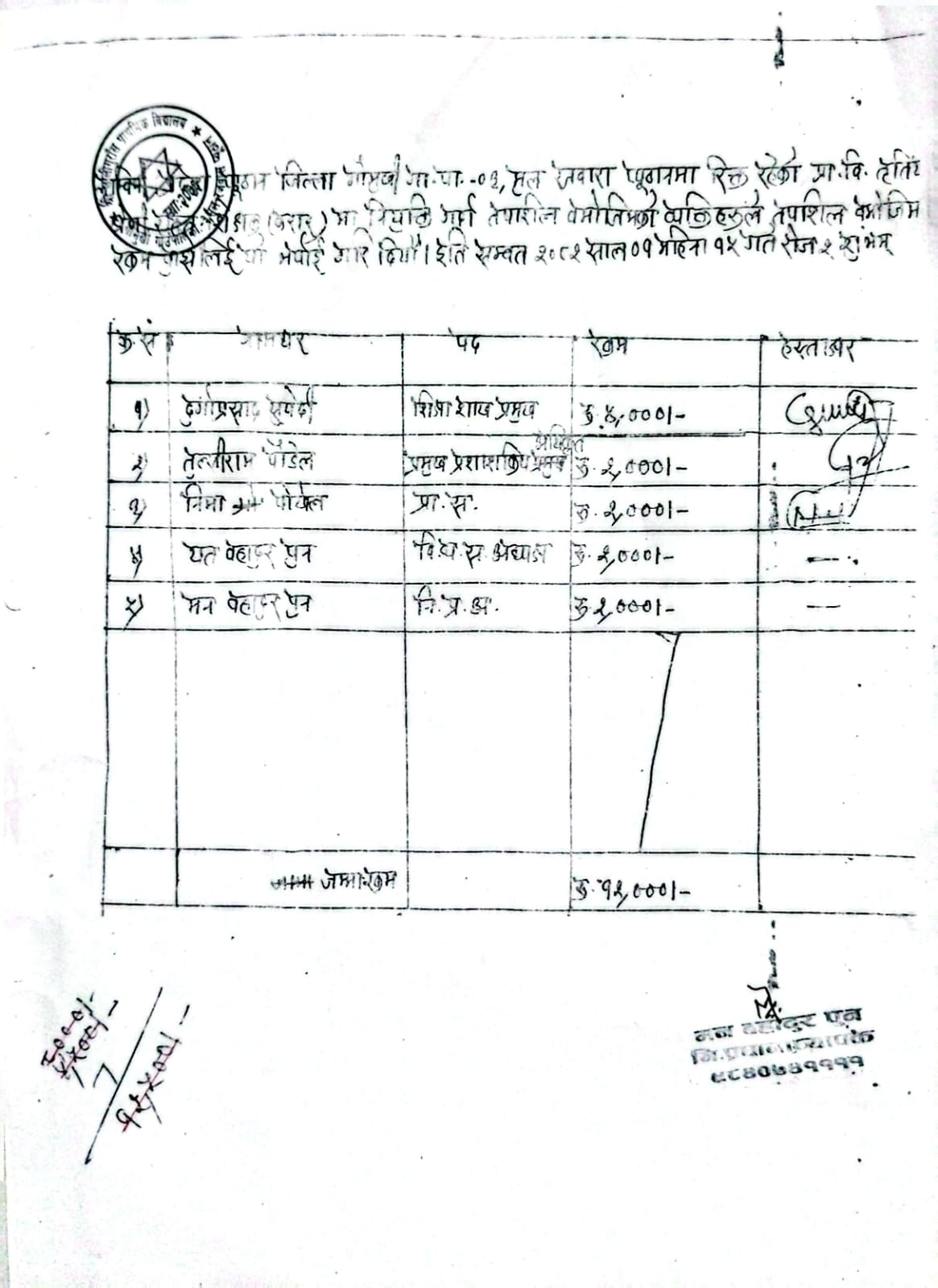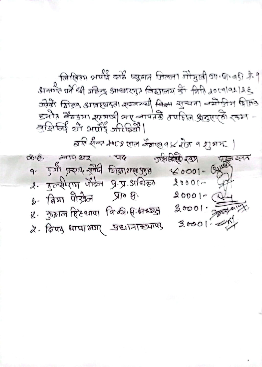 हामीलाई प्राप्त ३ वटा विद्यालयकाे भाैचर अनुसार अर्खाकाे महेन्द्र आधारभूत विद्यालय, रजवाराकाे ज्ञानाेदय आधारभूत विद्यालय र जीवनसुधार प्राविका प्रअ तथा अध्यक्षले दुई दुई हजार रकम बुझेका छन् तर लालिगुराँस आधारभूत विद्यालयका प्रअ र अध्यक्षले भने विद्यालयलाई अनावश्यक आर्थिक भार पर्ने ठानेर शिक्षा शाखा प्रमुख दुर्गा सुवेदीले टाँचा लगाइदिएकाे ३/३ हजारकाे बिलाे हामीसँग बताएका छन् । भाैचरमा पनि उनीहरुले रकम नबुझेकने प्रष्ट देखिन्छ ।