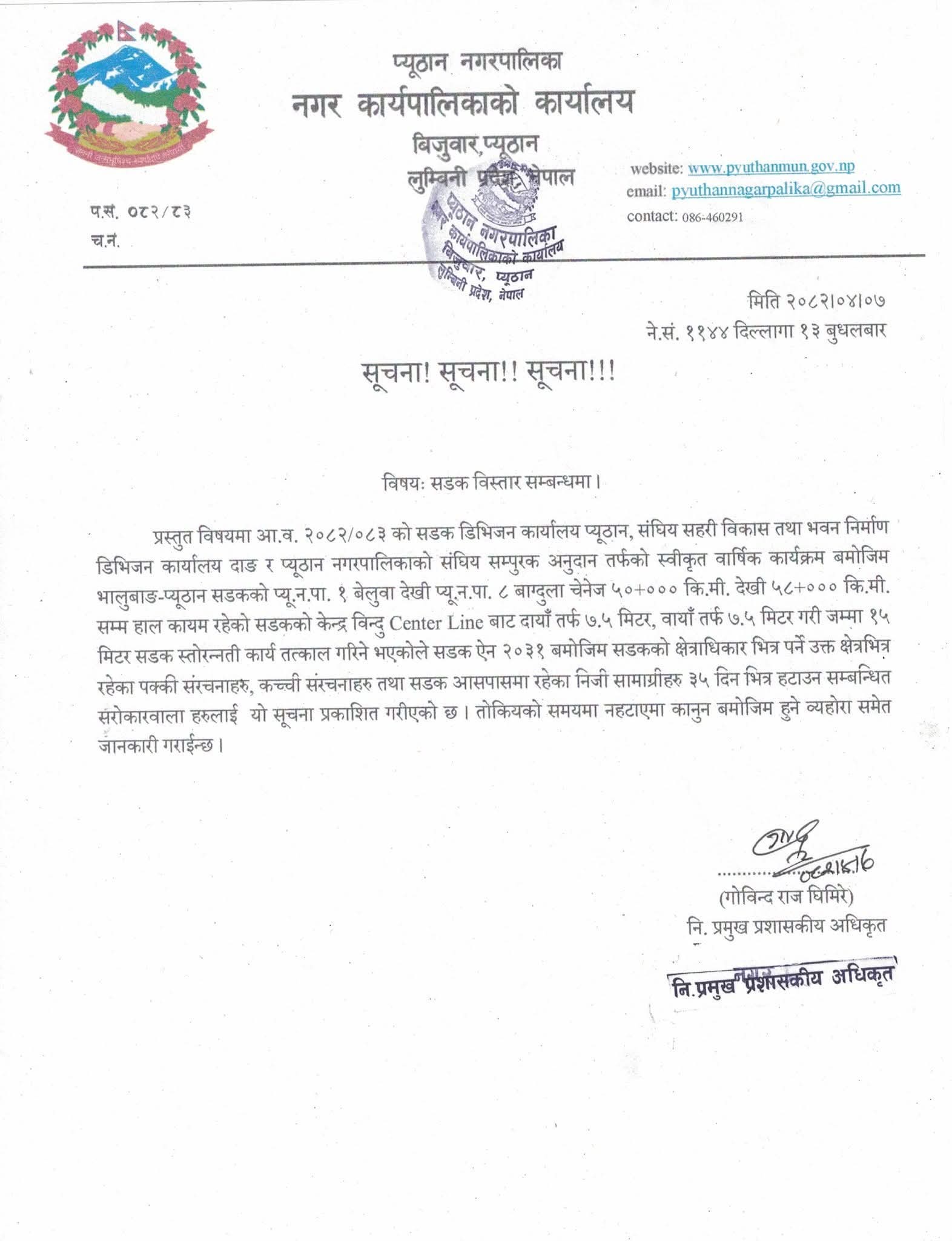 भालुबाङ – प्युठान सडकमा पर्ने बेलुवा देखि बग्दुलासम्मको सडकको केन्द्र विन्दु (Center Line) बाट दायाँ तर्फ ७.५ मिटर, वायाँ तर्फ ७.५ मिटर गरी १५ मिटर सडक स्तोरन्नती कार्य तत्काल गरिने भएकोले सडकको क्षेत्राधिकारभित्र पर्ने सम्पुर्ण संंरचना ३५ दिन भित्र हटाउन नगरपालिकाले सुचनामा उल्लेख गरेको छ ।
