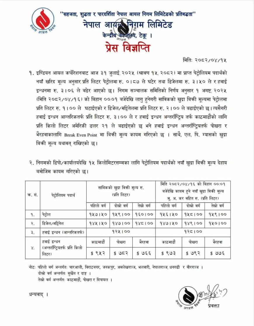 राति १२ बजेदेखि लागू हुने गरी पेट्रोलमा प्रतिलिटर एक रुपैयाँ घटाइएको हो भने डिजेल र मट्टीतेल प्रतिलिटर दुई रुपैयाँ बढाइएको छ।