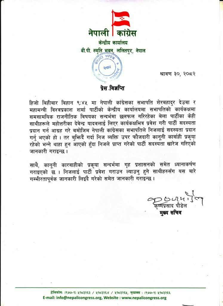 जारी विज्ञप्तिमा भनिएको छ, ‘केही साथीहरूले महोत्तरीका देवेन्द्र यादवलाई लिएर कार्यकक्षभित्र प्रवेश गरी पार्टी सदस्यता प्रदान गर्न आग्रह गरे बमोजिम नेपाली कांग्रेसका सभापतिले निजलाई सदस्यता प्रदान गर्नु भएको हो । तर बुझ्दै गर्दा निज व्यक्ति उपर फौजदारी कानुनी कारबाही प्रक्रिया रहेको भन्ने थाहा हुन आएको हुँदा निजले प्राप्त गरेको पार्टी सदस्यता खारेज गरिएको जानकारी गराइन्छ ।’