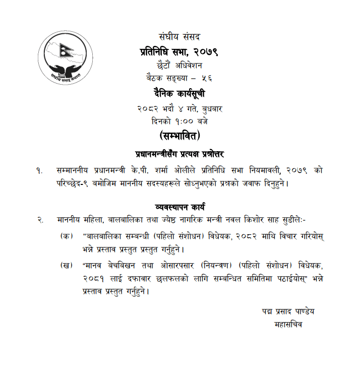 यस्तै मानव बेचविखन तथा ओसारपसार (नियन्त्रण) पहिलो संशोधन विधेयक, २०८१ लाई दफावार छलफलका लागि सम्बन्धित समितिमा पठाइयोस् भन्ने प्रस्ताव पनि प्रस्तुत हुनेछ।